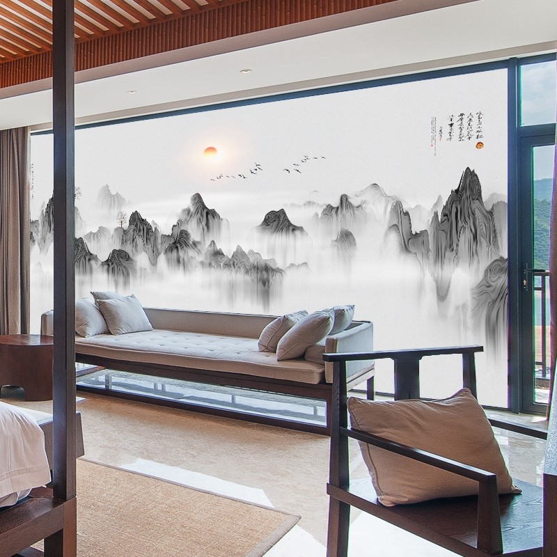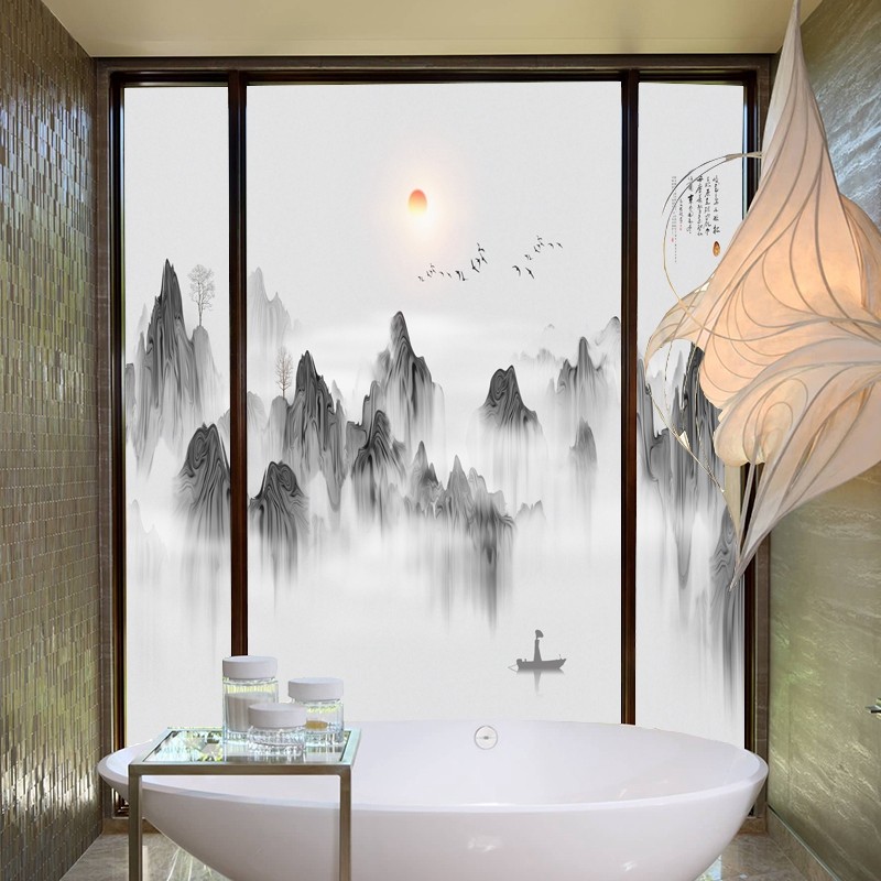 Kitchen sliding door glass sticker transparent opaque Chinese landscape living room compartment door frosted film Chinese style