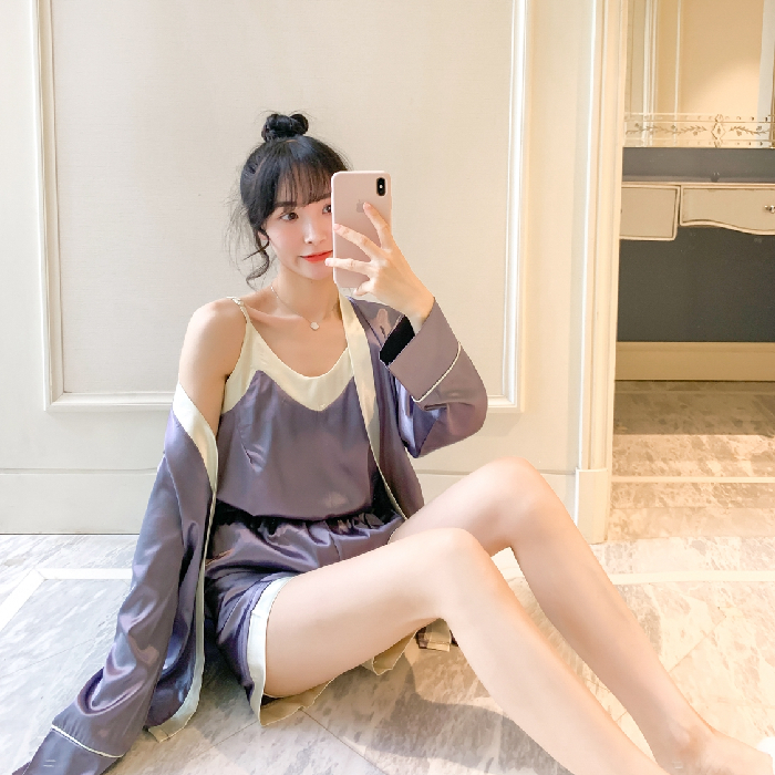 Sleepwear Women's Summer Ice Silk Harnesses Shorts Three Suits Sleeping Robes Han Genuine Silk Spring Autumn Sexy Easy Home Clothes