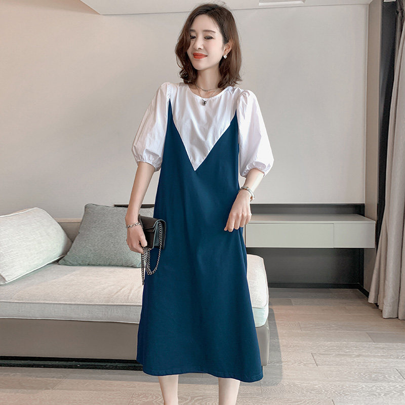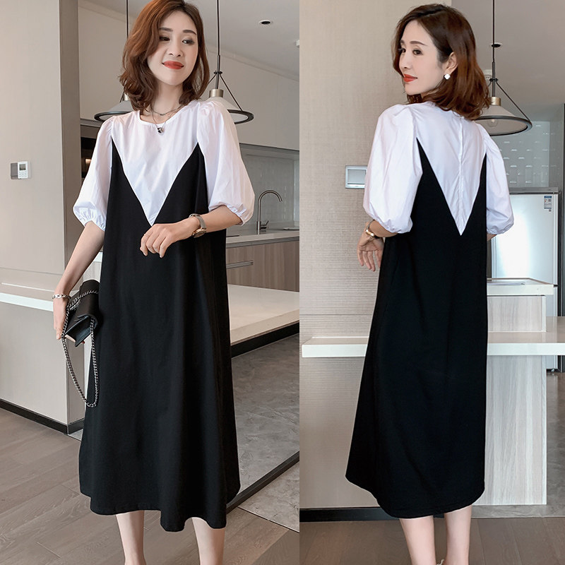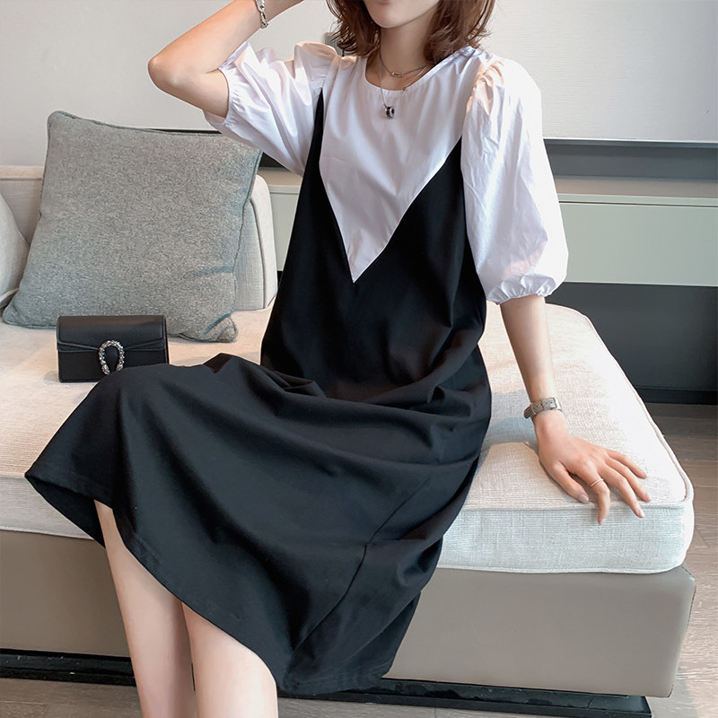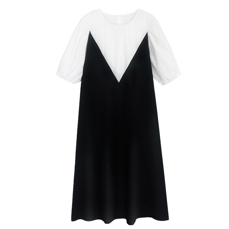 Black & White Splicing Ocean Dress Summer Europe Station 2022 New European Goods Tide Bubble Cuff Fake Two Sets Casual Long Skirt Woman
