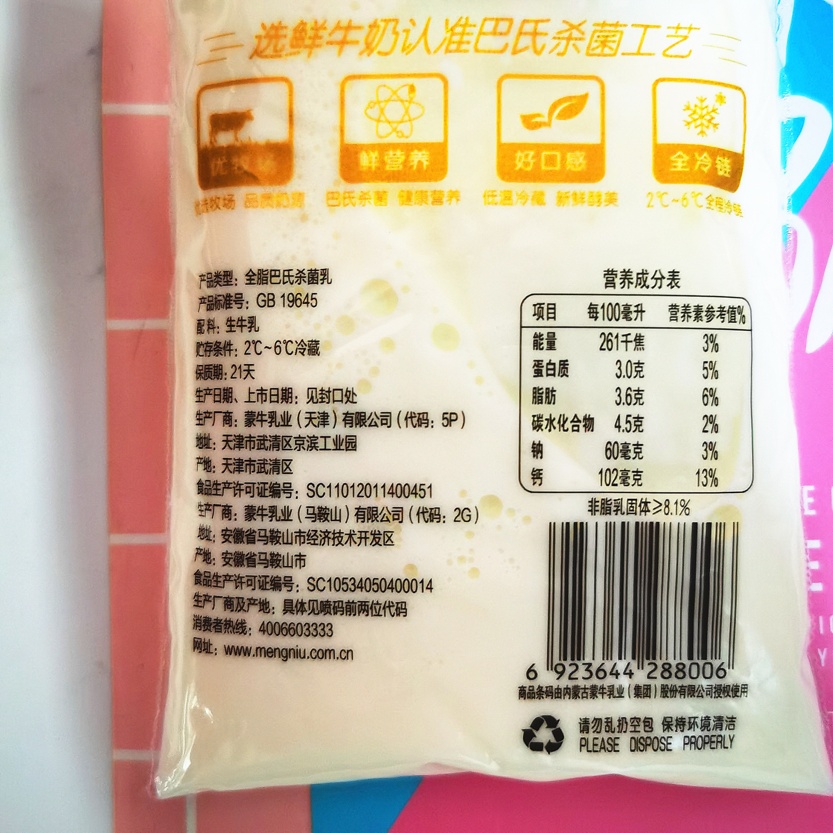 Mengniu fresh milk bag 180g * 12 bags of pasteurized children pregnant women nutrition breakfast milk whole box