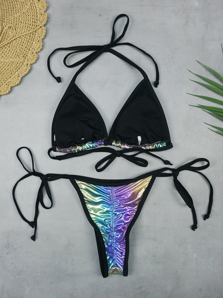 Patent leather sexy three-point thong high split strap bikini swimsuit European beach bikini women's swimsuit
