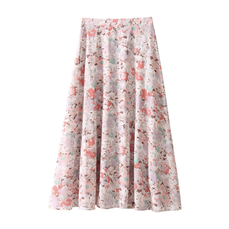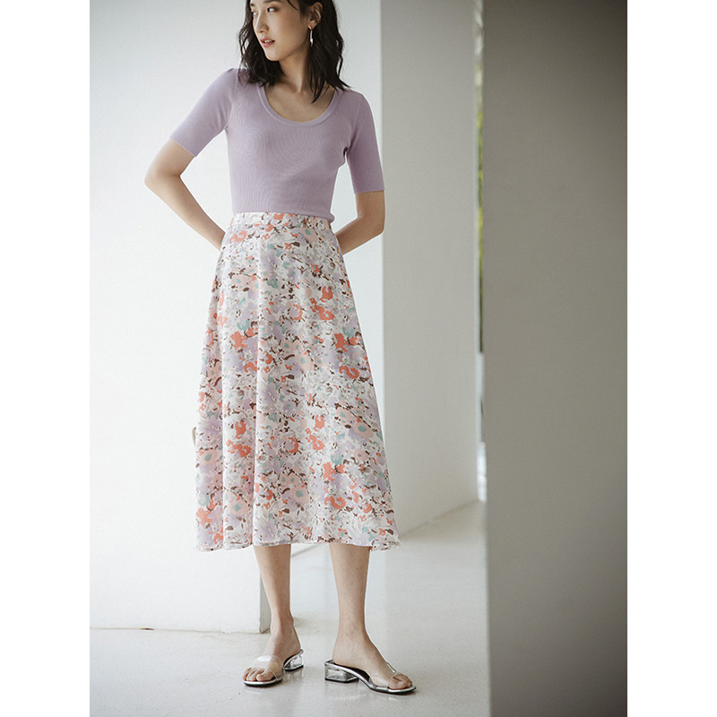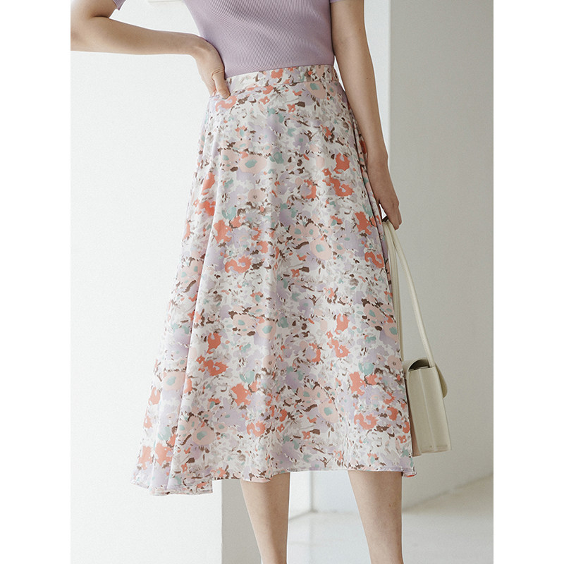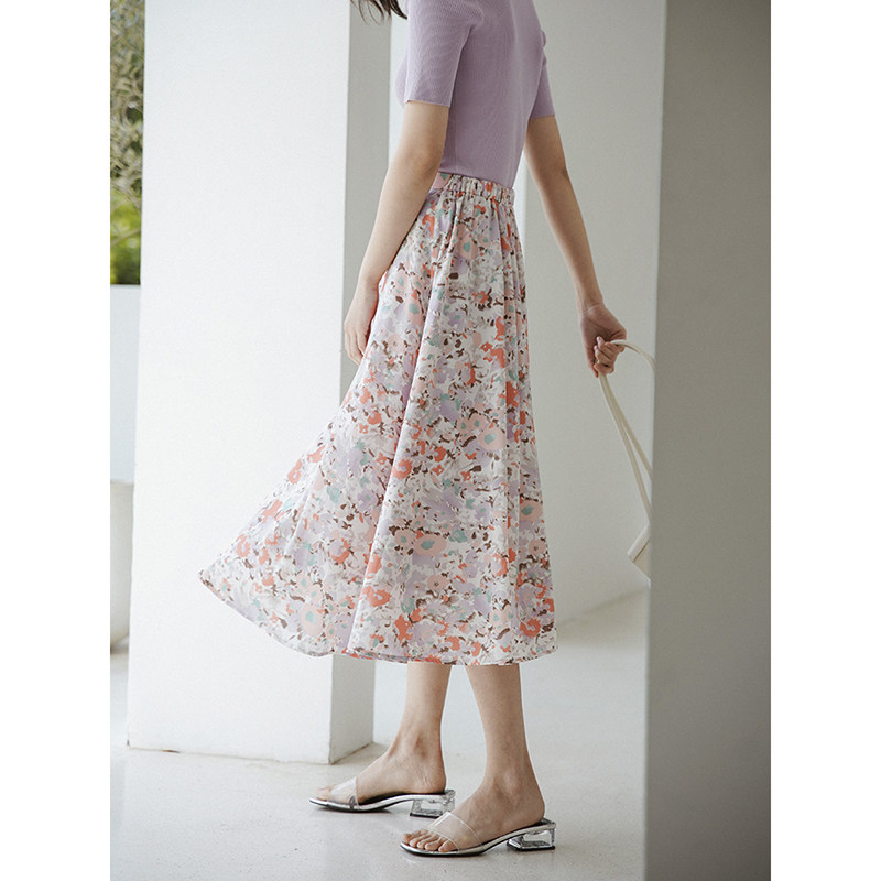 Ou Ke Rui Summer abstract print ~ small fresh purple small floral skirt mid-length version A-line holiday girl