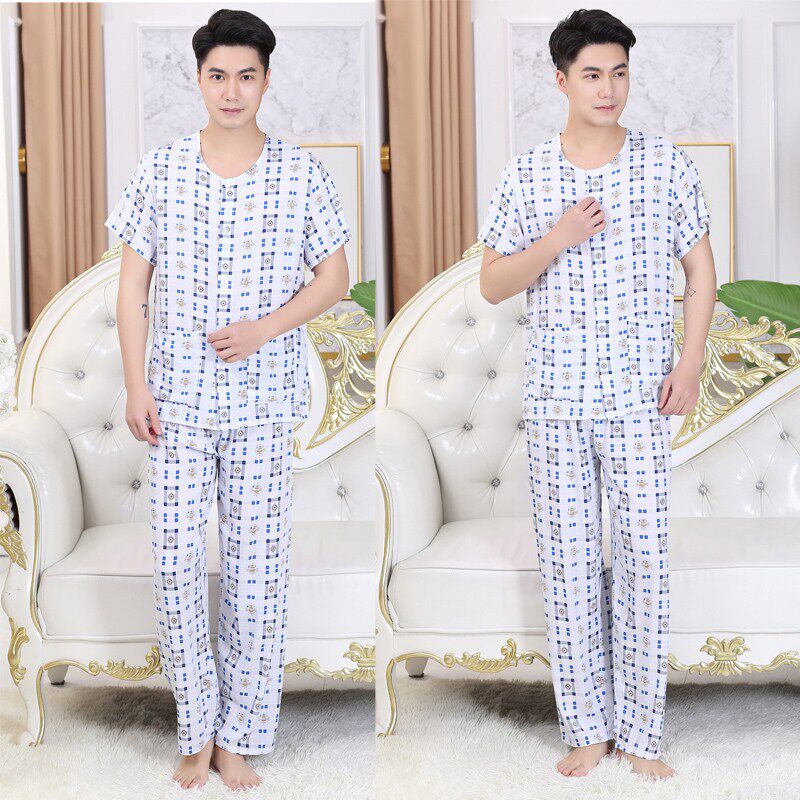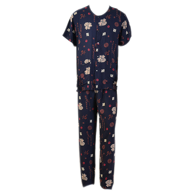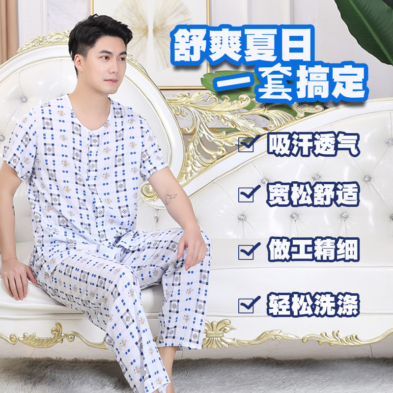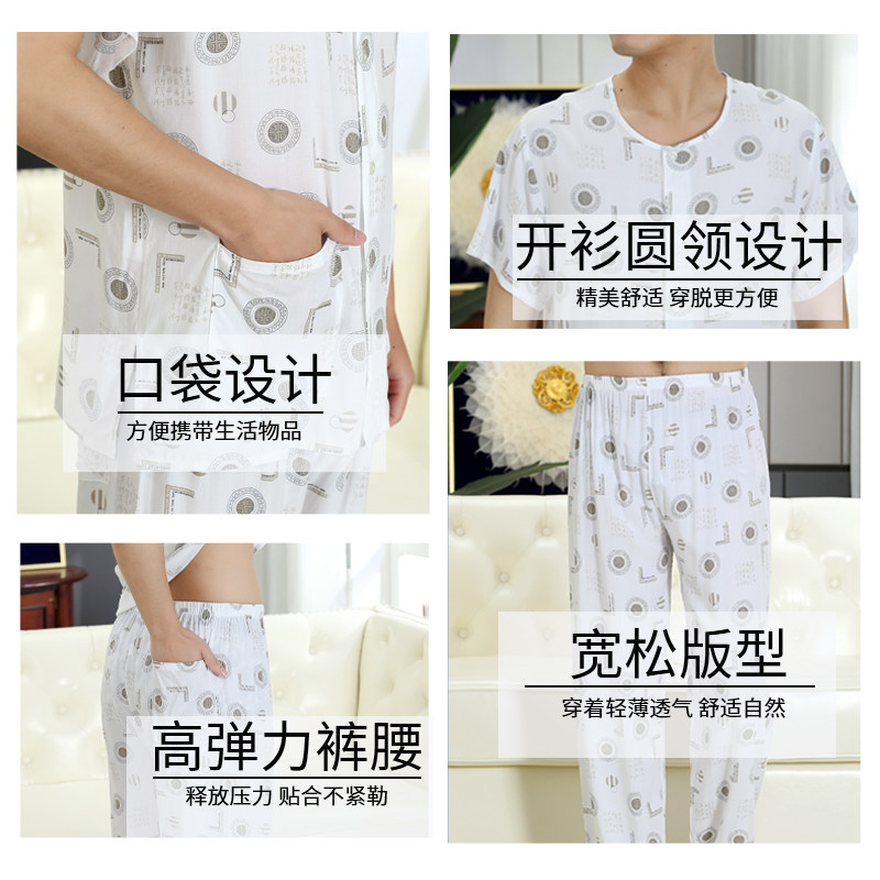 Cotton silk pajamas men's summer thin section loose plus fertilizer to increase short-sleeved trousers set cardigan middle-aged and elderly cotton home clothes