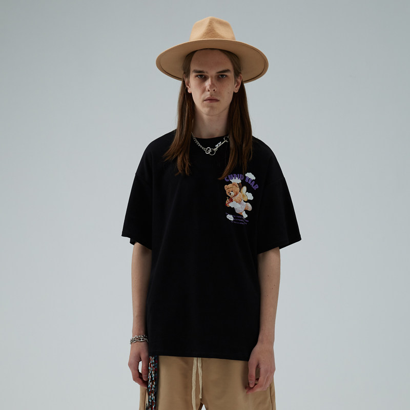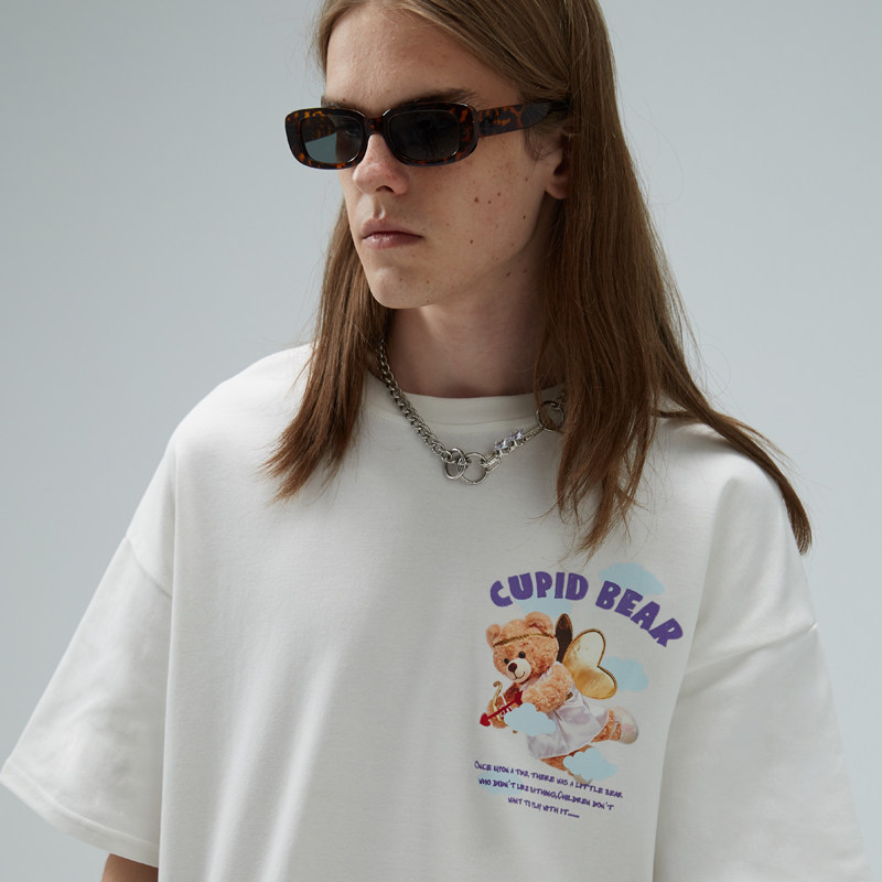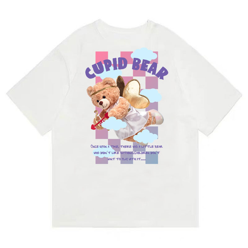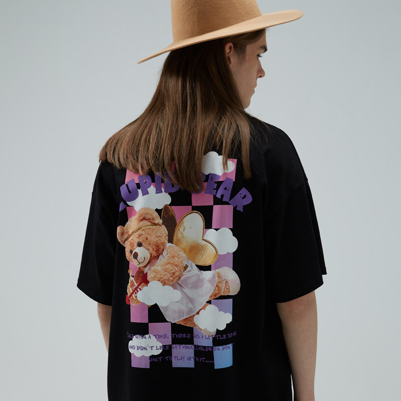 HTCU Cartoon Chessboard Grit Sky Small Bear Short Sleeve Hip Hop Street Loose Ins Couple Summer Clothes Casual T-Shirt Tide Card
