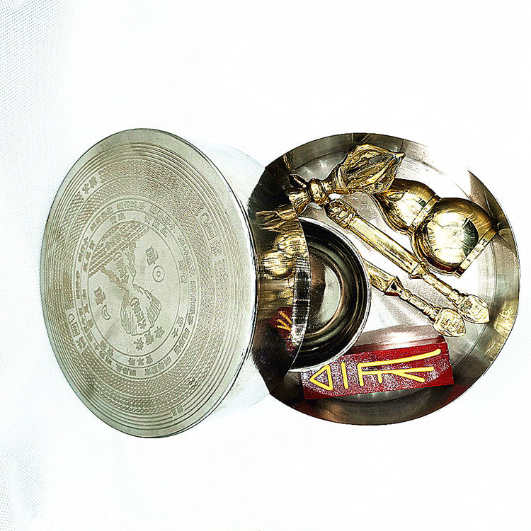 Copper five-stock vajra (brass color) Copper five-stock tibetan pestle (black and white) Copper Sun and Moon pestle (brass color) Water bottle (brass color)Fu Ruler(mahogany color gold) Rice bowl single price (silver white