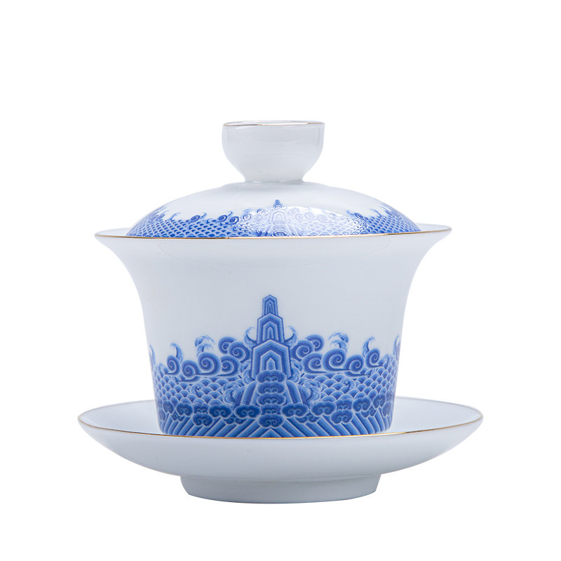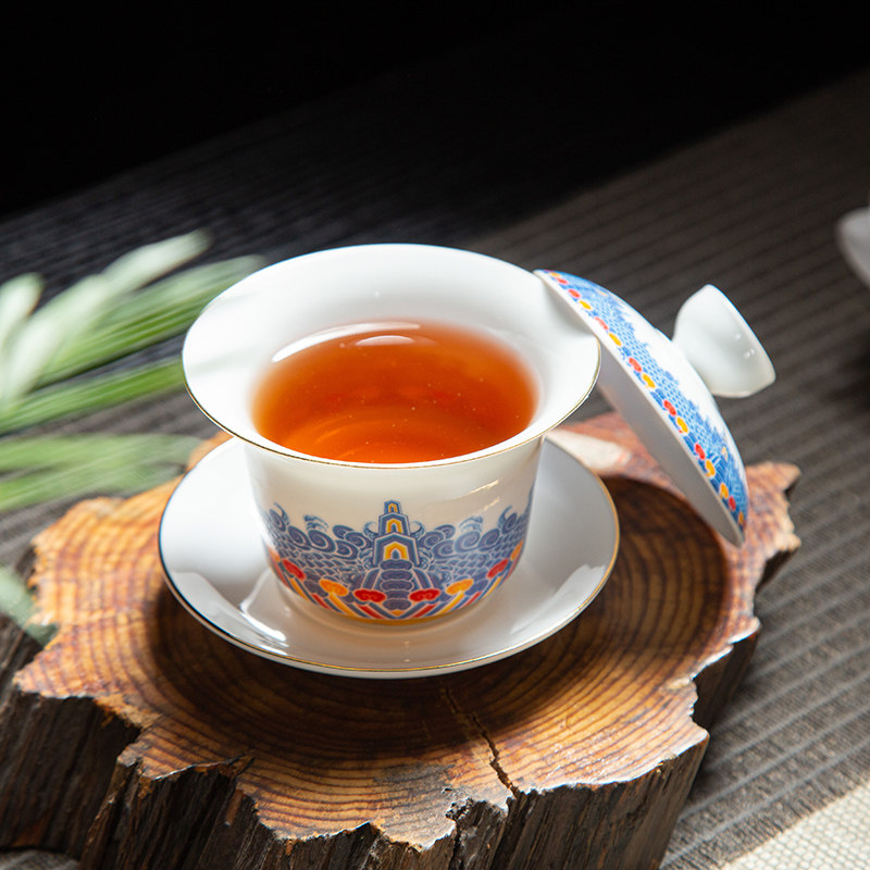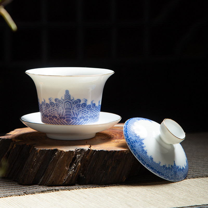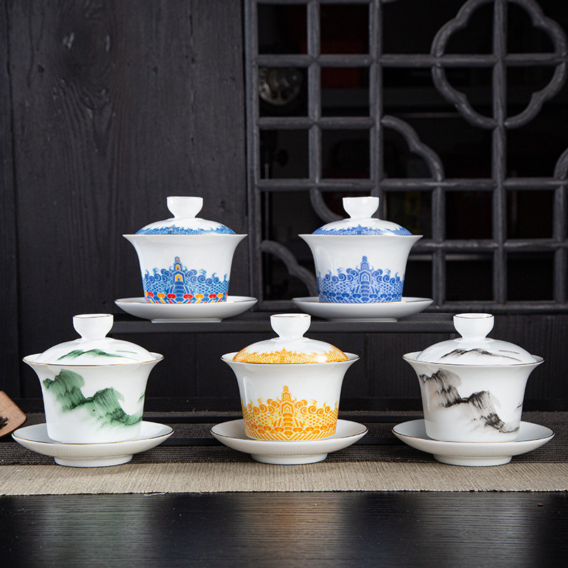Dehua Blue Palace Tinted Wind Cover Bowl Tea Bowl Kung Fu Tea Bowl White Porcelain Yellow Triple toast Tea Tea Bowl ink Ink Ceramics