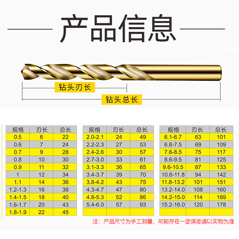 1.5-6.5 (high cobalt 13 piece set) 0.8mm (5pcs) 1mm(2pcs) 1.2mm(2pcs) 1.5mm(2pcs) 1.8mm(2pcs) 1.9mm(2pcs) 2mm(2pcs) 2.2mm(2pcs) 2.5mm(2pcs) 2.6mm(2pcs) 2.8mm(2pcs) 2.9mm(2pcs) 3.0mm(2pcs) 3.1mm(2pcs) 3.2mm(2pcs) 3.3mm(2pcs) 3.4mm(2pcs) 3.4mm(2pcs) 3.5mm(2pcs) 3.8mm(2pcs) 4.0mm(2pcs) 4.1mm(2pcs) 4.2mm(2pcs) 4.3mm(2pcs) 4.4mm(2pcs) 4.5mm(2pcs) 5.0mm 5.1mm 5.2mm 5.3mm 5.5mm 6mm 6.2mm 6.5mm 6.8mm 7.0mm 7.2mm 7.5mm 7.8mm 8.0mm 8.2mm 8.5mm 8.8mm 9.0mm 9.5mm 10mm 10.5mm 10.8mm 11mm 11.5mm 12mm 12.5mm 13mm Drilling stainless steel wrapped back 14mm
