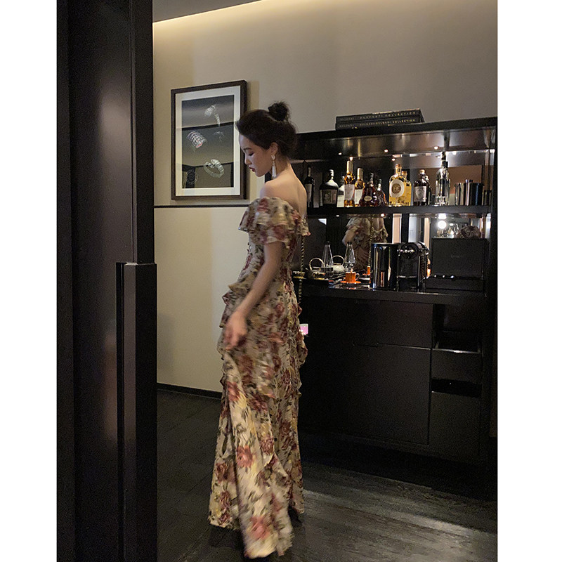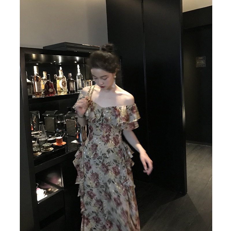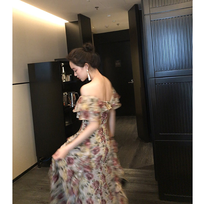 viss gold French retro floral dress women's waist is thin and sweet temperament goddess Fan Chiffon A-line dress