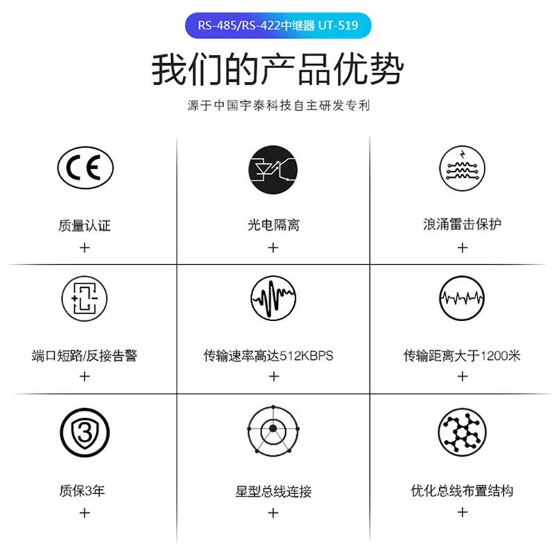 Utai (UTEK) industrial grade high performance RS-485 422 repeaters light isolation anti-surge UT-519