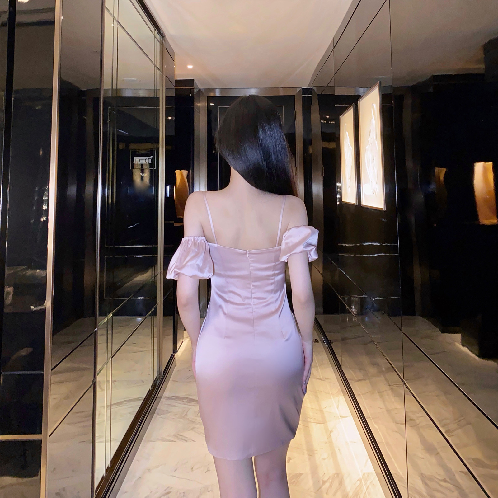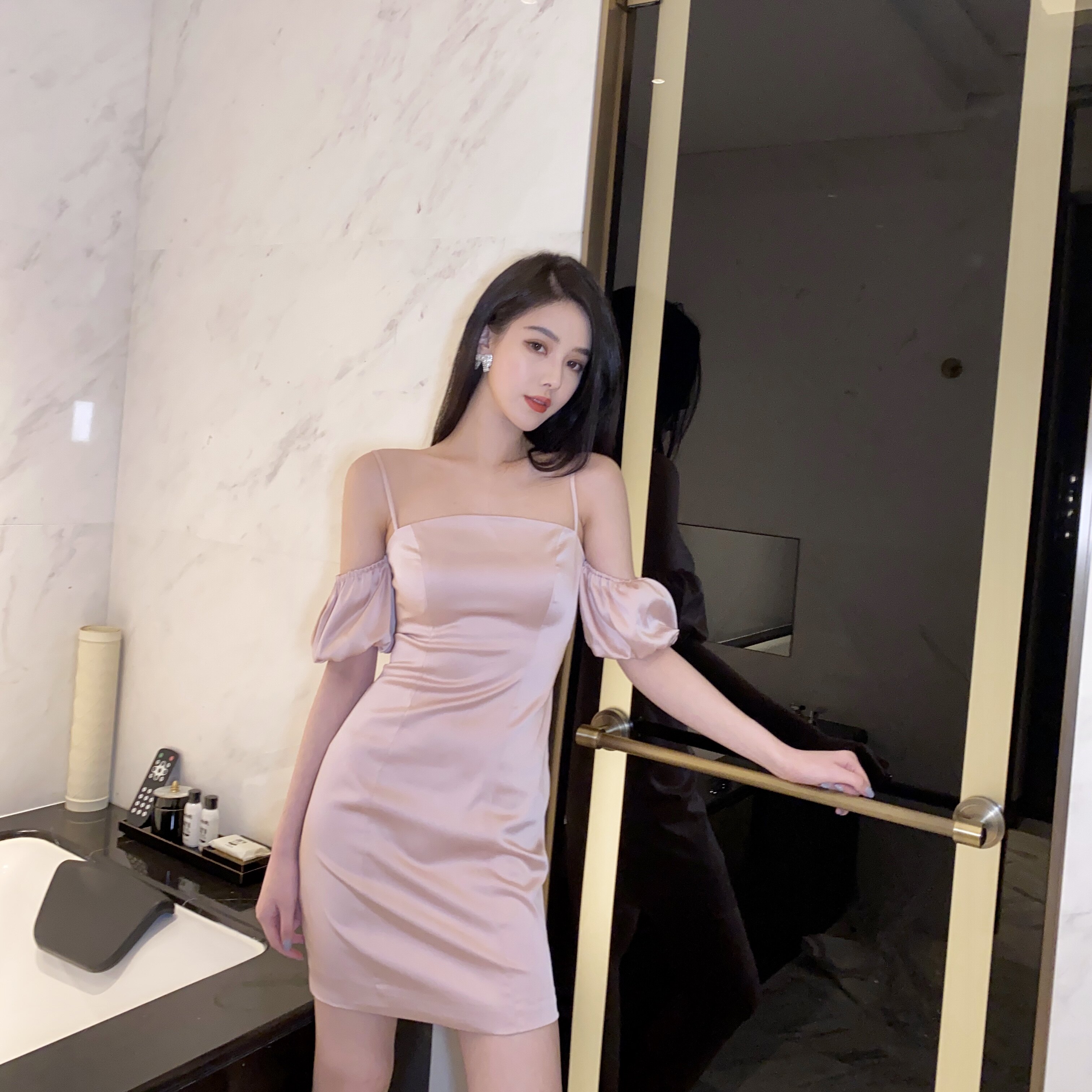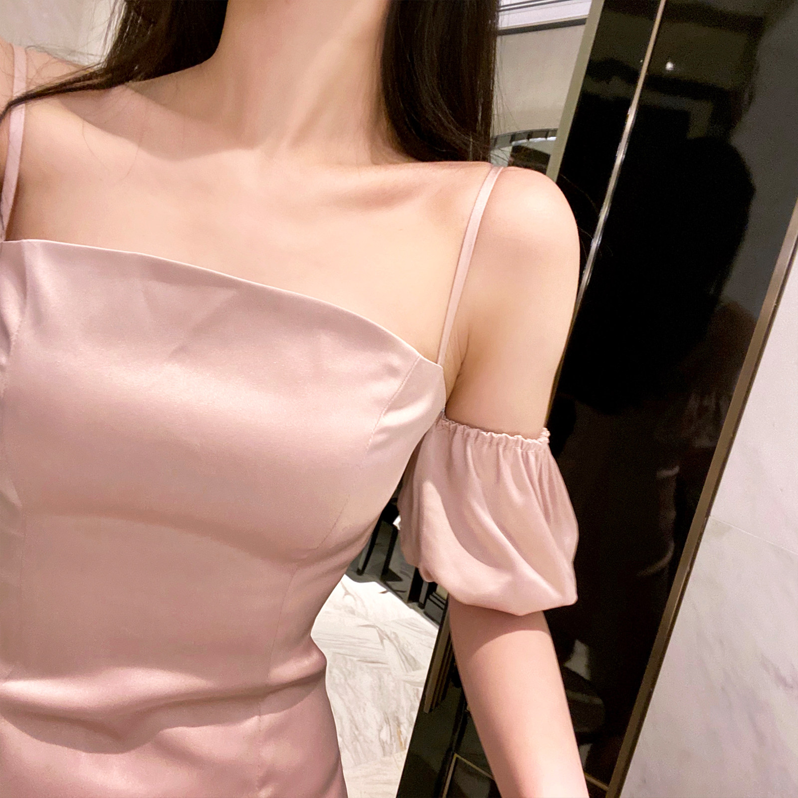 nicky French style puff sleeves high waist suspender dress women's summer 2022 new waistline thin suspender skirt temperament