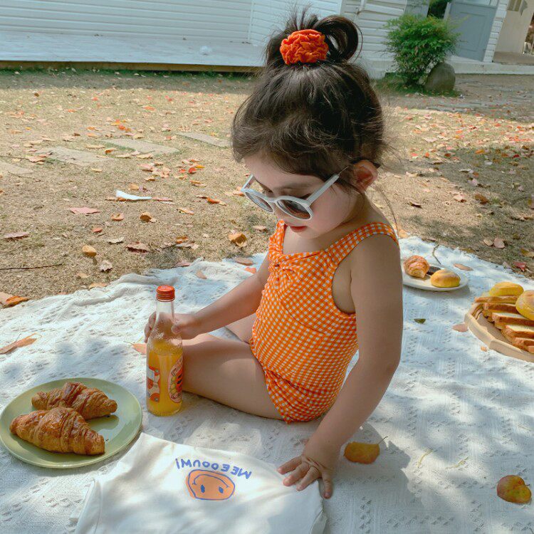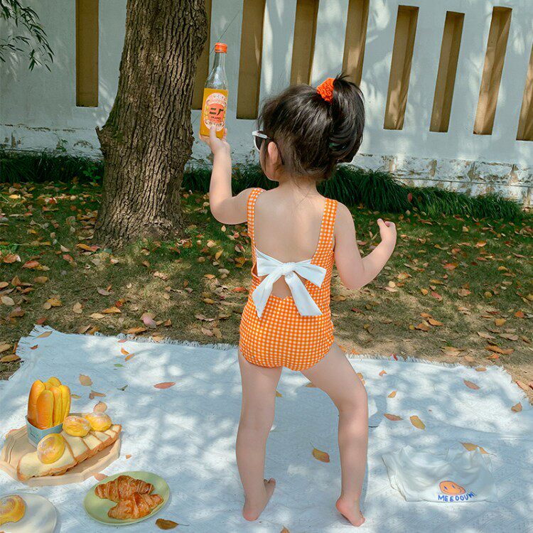 Girls Swimsuit 2022 New Baby Girl Foreign Qi One-Piece Bikini Beach Summer Plaid Net Red Swimsuit Suit