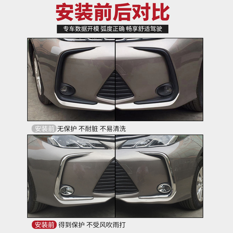 New Corolla (Front Fog Lamp Shade 1 pair) Plated Bright New Corolla (Front Fog Lamp C-Type Trim 1 Pair) Electro-plated New Corolla (Front Fog Lamp Shade 1 Pair + Fog Lamp C-Type Trim 1 Pair) Electroplated Bright (Recommended) New Corolla (Rear Tail Box Trim 1 Piece) Electroplated Bright