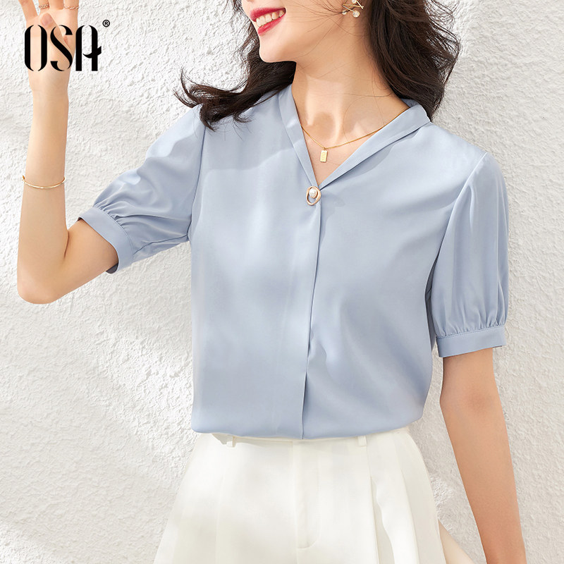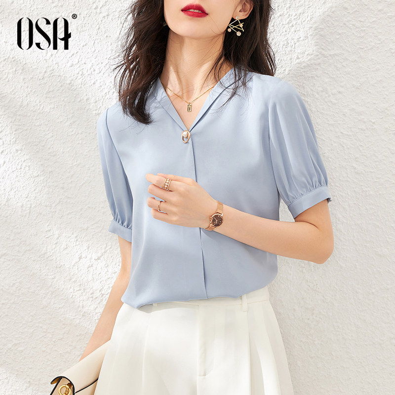 OSA profile blue professional chiffon shirt women's summer 2021 new fashion V-neck shirt short-sleeved top