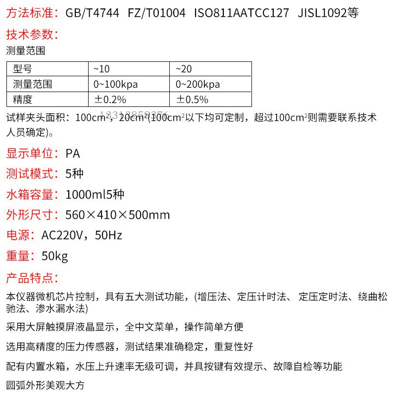 Textile percolation tester melt spray cloth protective clothing fabric Hydrostatic Water Pressure Performance Determination Instrument Testing Machine