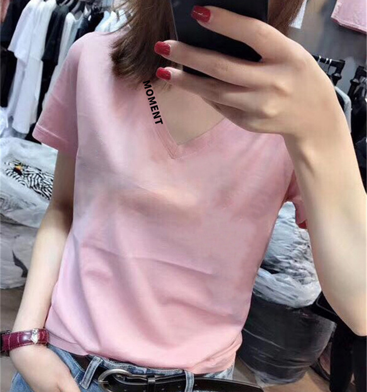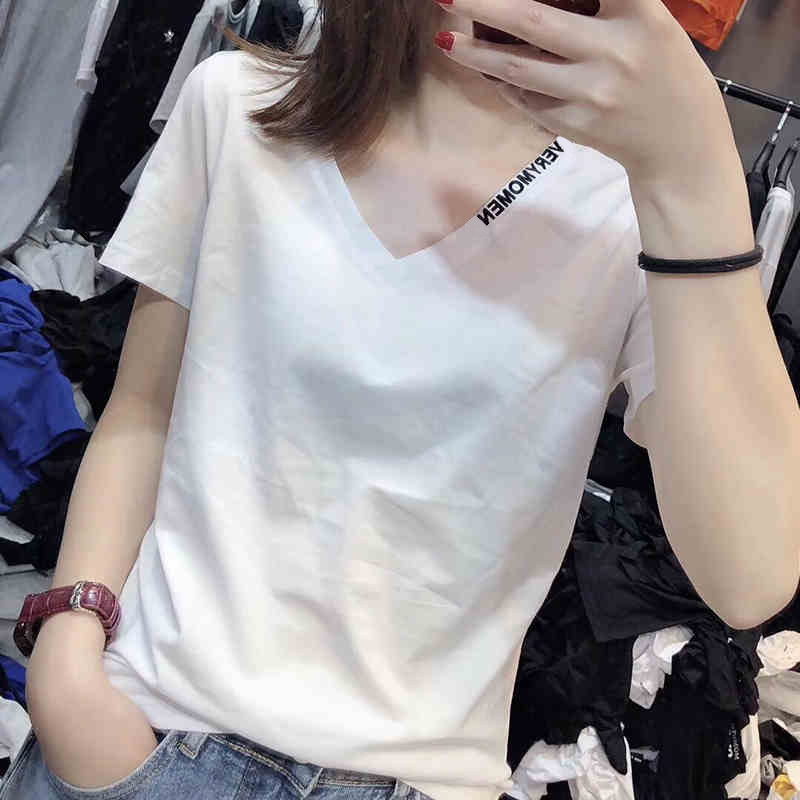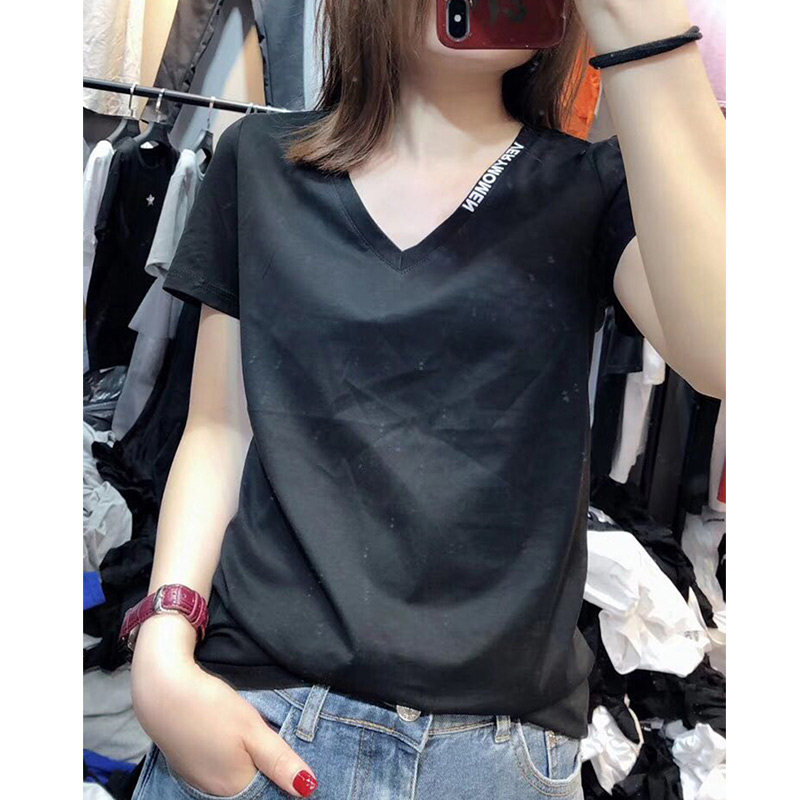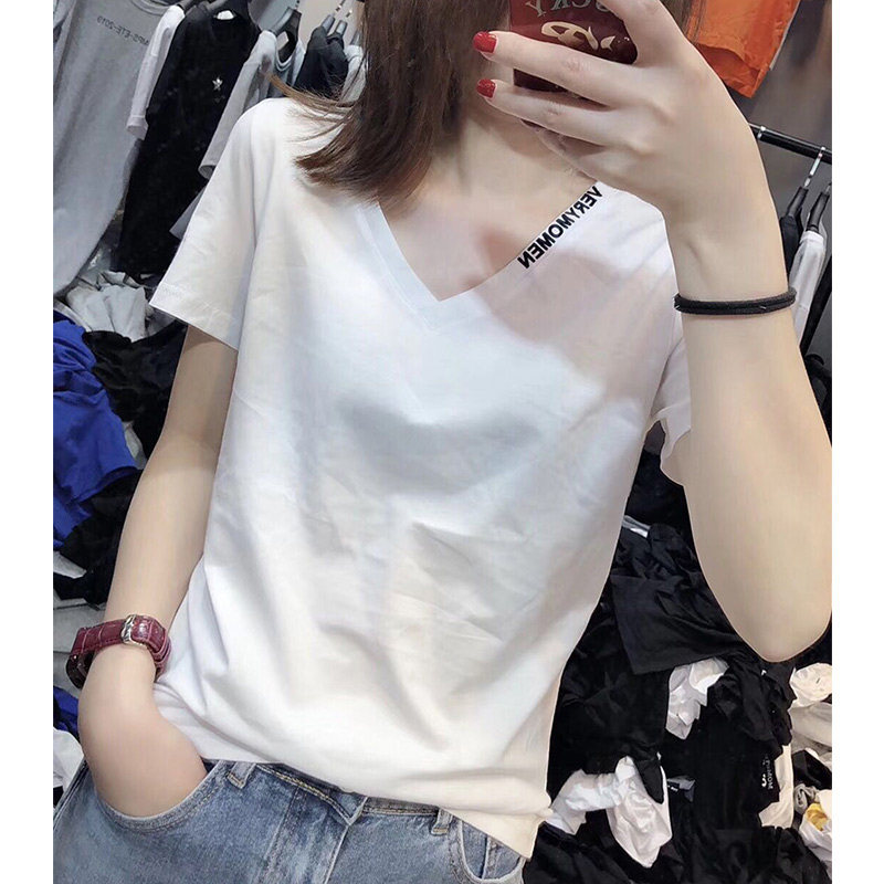 European station V-neck white T-shirt women's short-sleeved slim fit 2022 summer new European goods cotton half-sleeved all-match top trendy