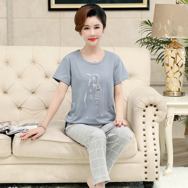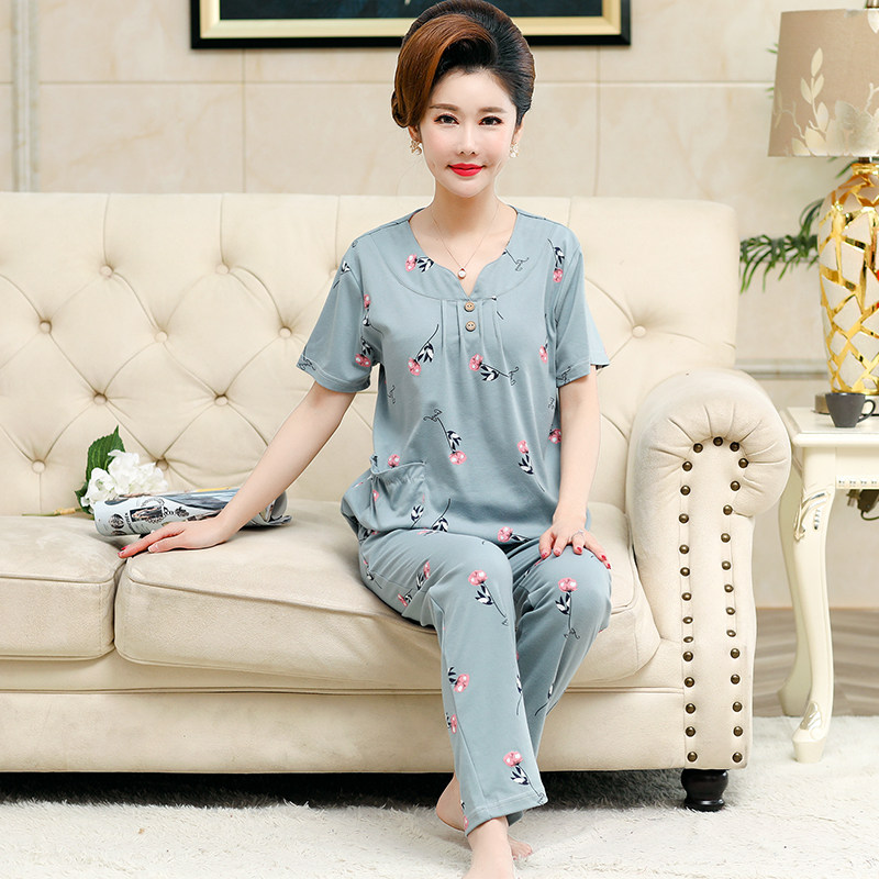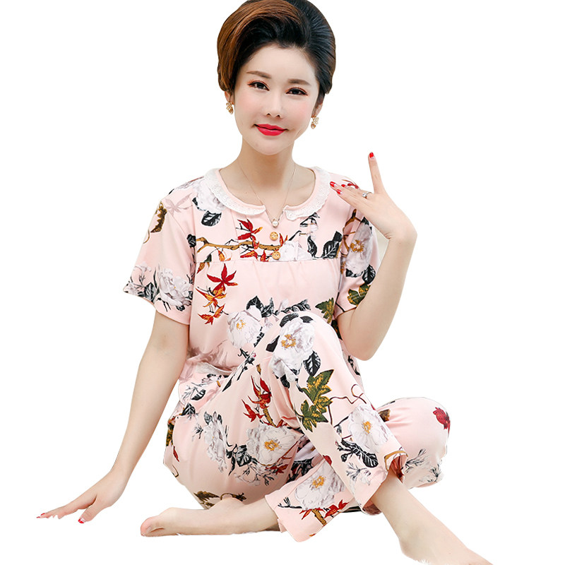 Pajamas ladies summer short sleeve pants cotton thin summer household clothing short sleeve plus size middle-aged mother suit