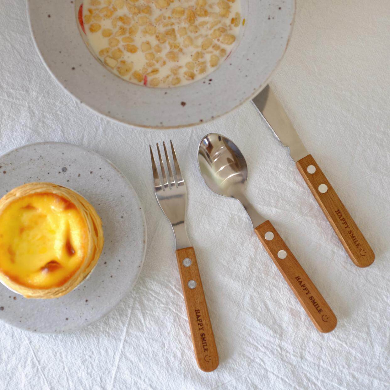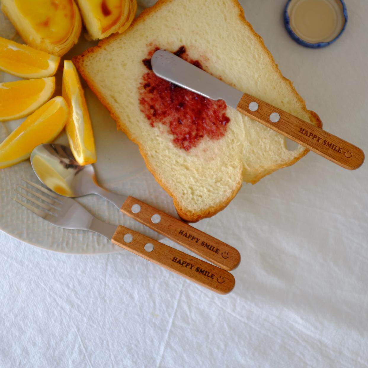 Japanese Vinoguins Wind Smiley Face Wood Handle Knife Fork Spoon Suit Sweet Spoons Cheese Knife Minimalist Gourmet Photography Photo