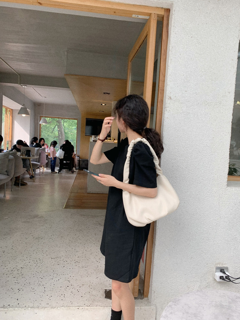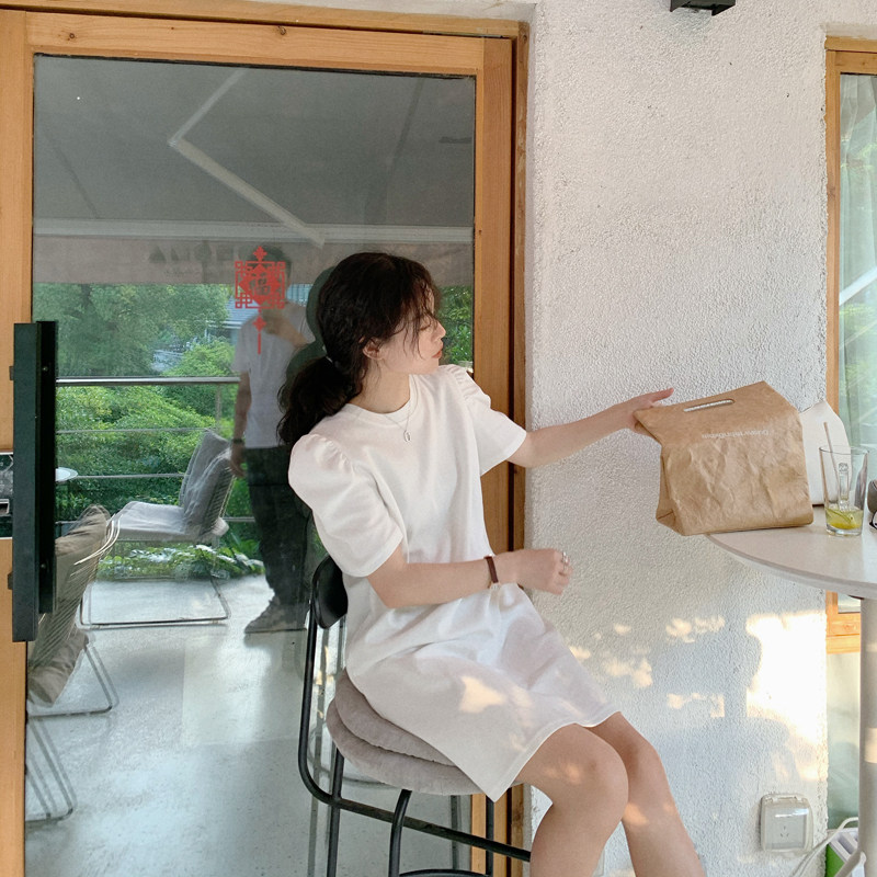Jin Suyi Puff sleeve T-shirt skirt 2022 summer Korean version of casual solid color short-sleeved dress long T-shirt women's tide