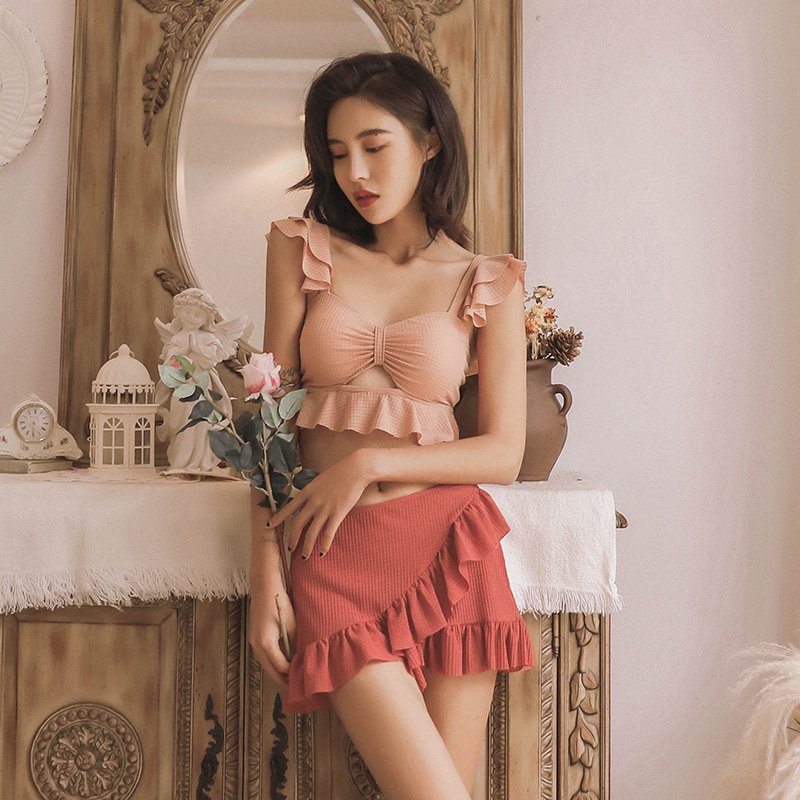 New swimsuit female split body three-piece set conservative cover belly show small chest gathering skirt type straight Angle Japanese INS wind