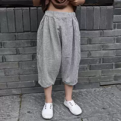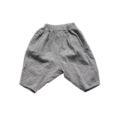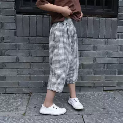 Cotton linen children's clothing summer boys and girls fine grid cotton Capri pants children thin loose plaid lob pants shorts
