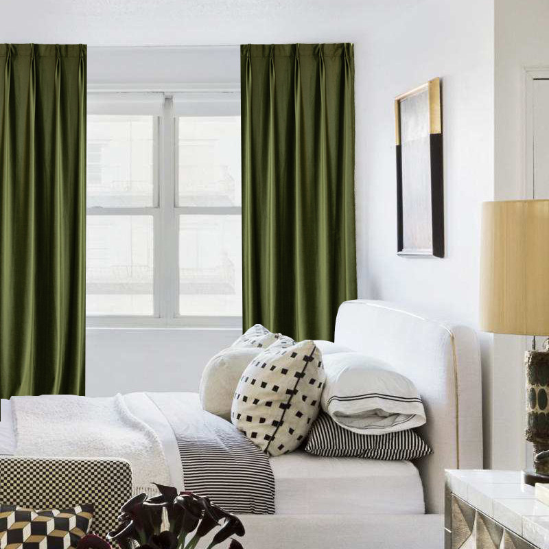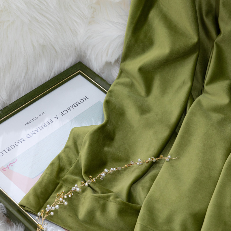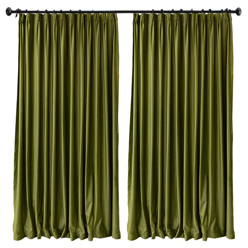 Bright olive green velvet curtain solid color French American European villa dark green bedroom living room floor-to-ceiling windows
