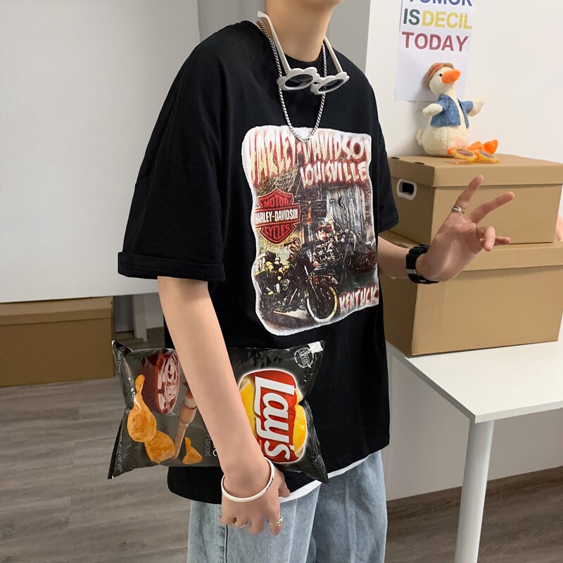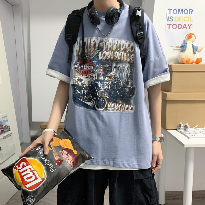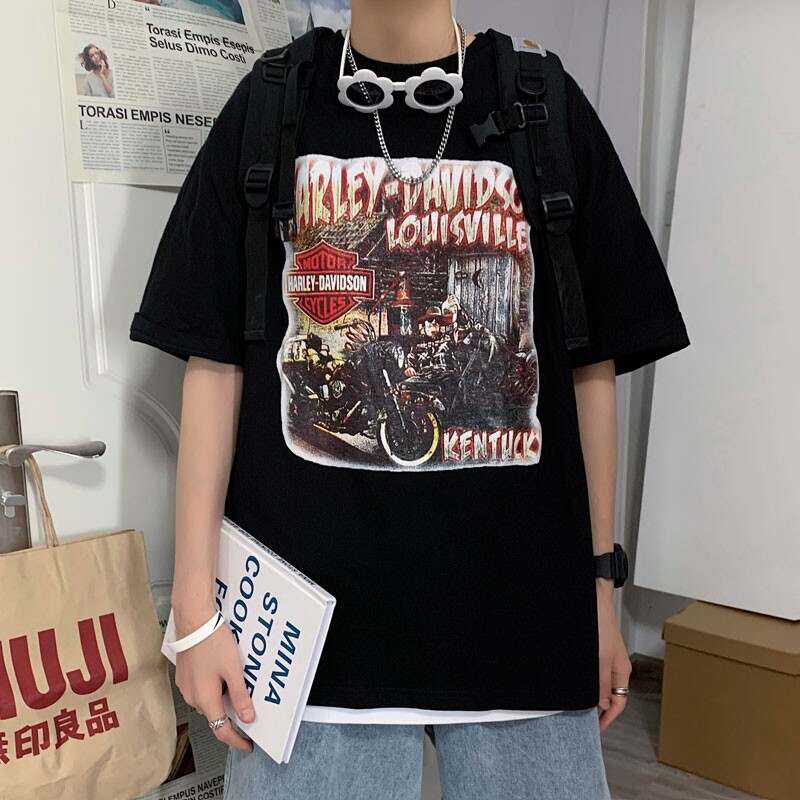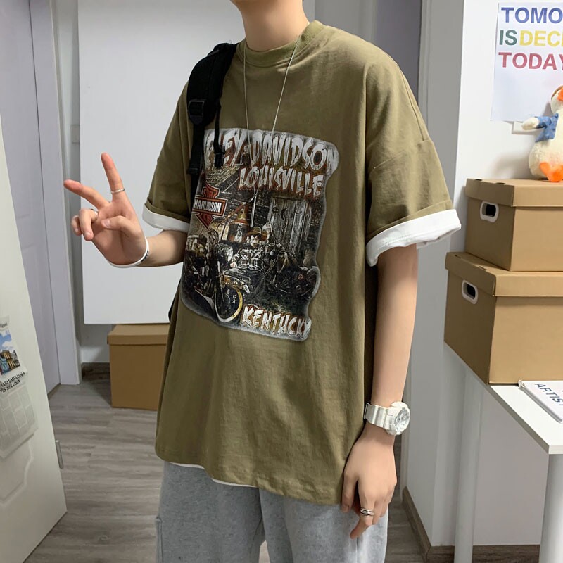 Harajuku style T-shirt boys tide card trend ins loose hip hop clothes summer harbor wind Joker trendy men short sleeve Korean version