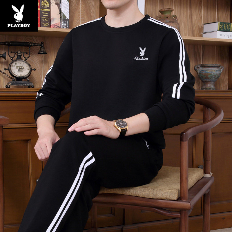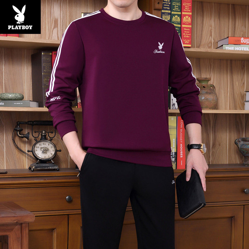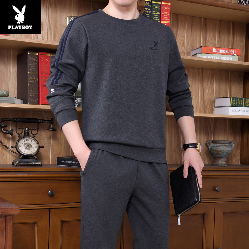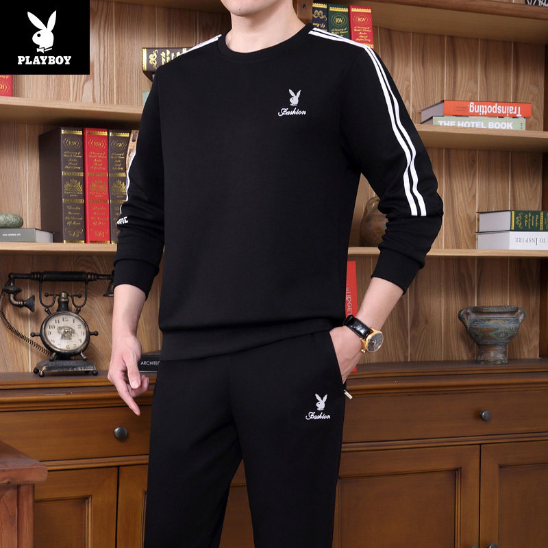 Floral Playboy Spring autumn necropolis Men's round collar Leisure pure cotton sports suit for young fat children Large size size Long sleeves T-shirt
