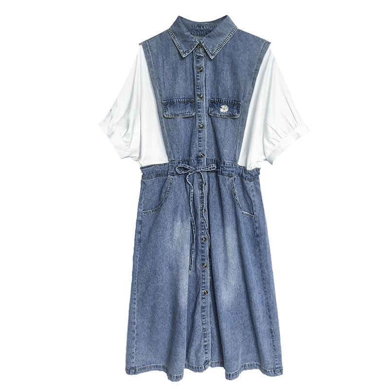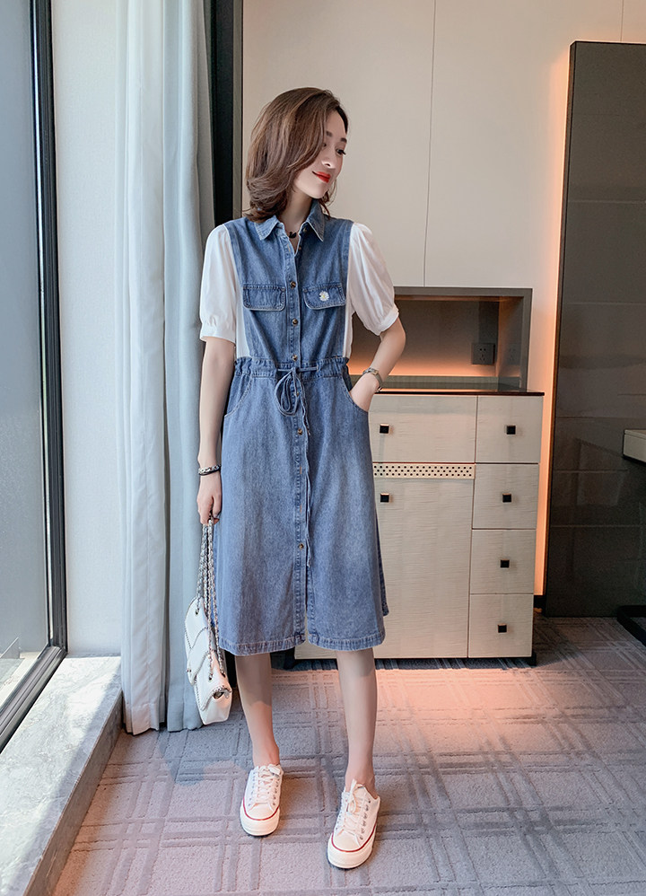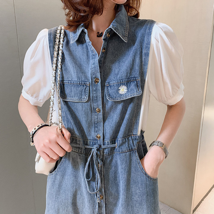 Denim Ocean Dress Woman Summer 2022 New European Station European Goods Advanced Sense Bubble Cuff Fake two closets Shirt Skirt