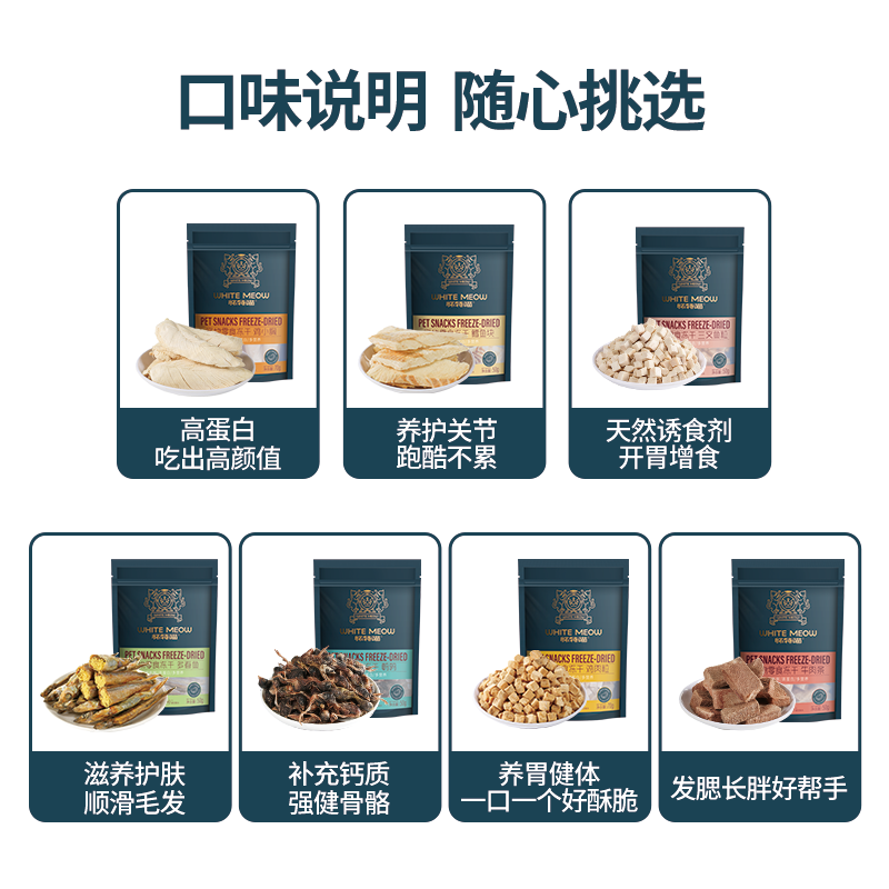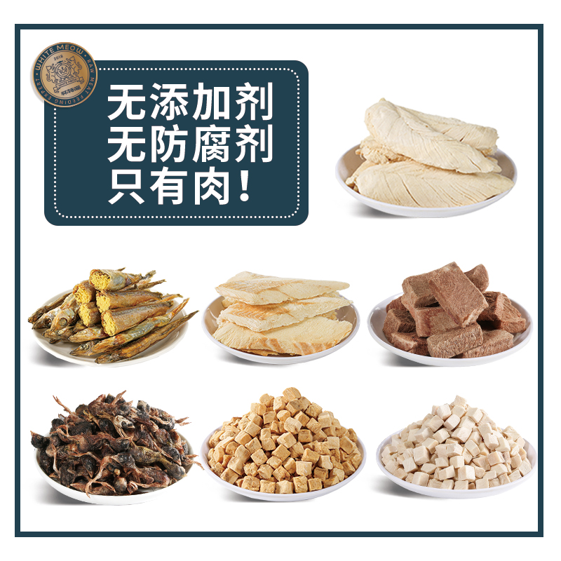White Meow Freeze-Dried Cat Snack Chicken Meat Grain Salmon Baby Cat Cod Cheek Fatten Quail Raw Bone Meat Cat Food