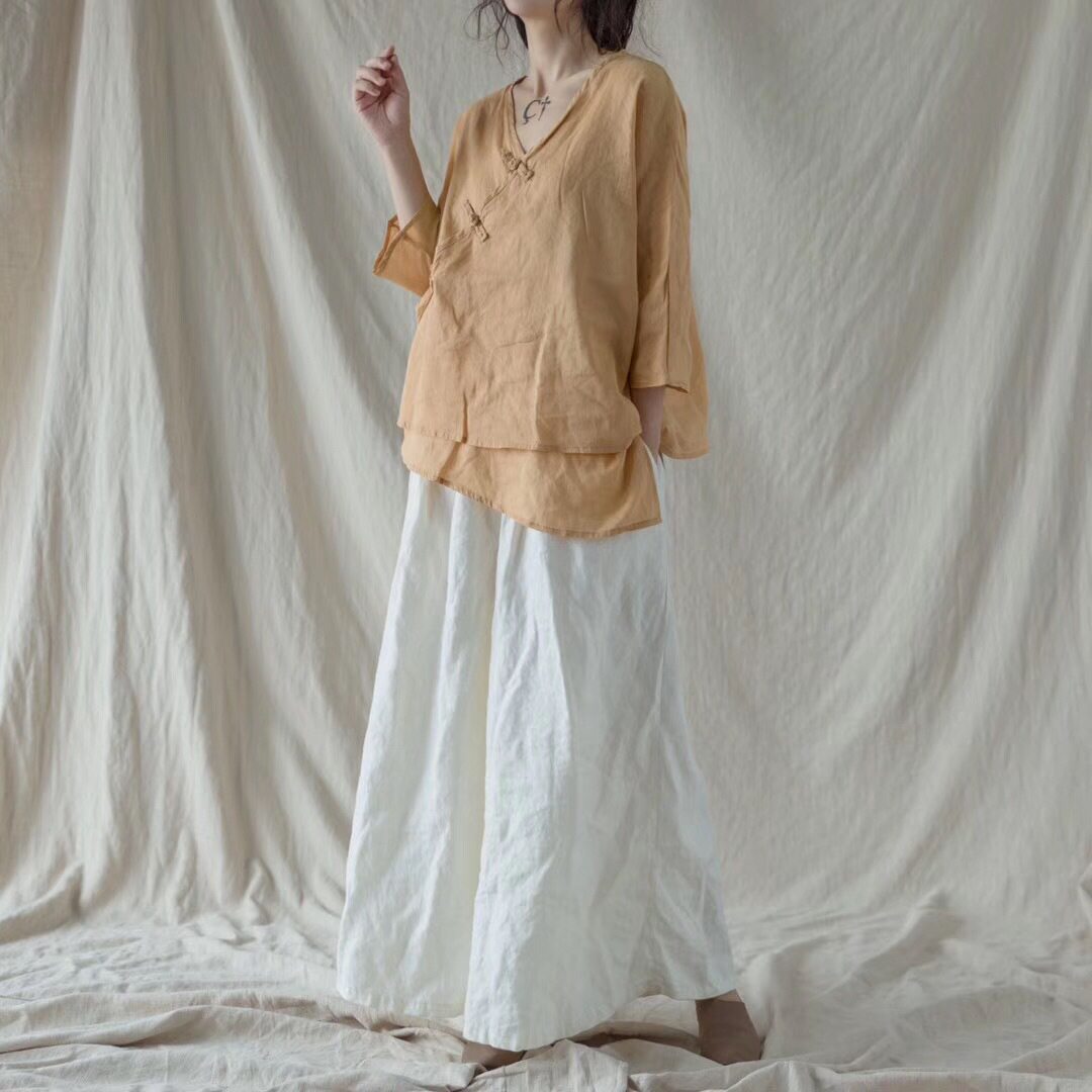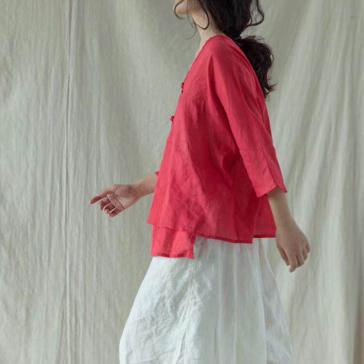 Summer shirt Chinese style tea clothes blouses for blouses Hemp Small Shirts Improved Hanfu Slanted Flap Disc Buckle Retro Art Linen Dress-Taobao