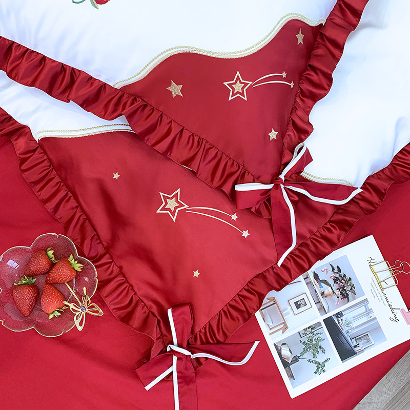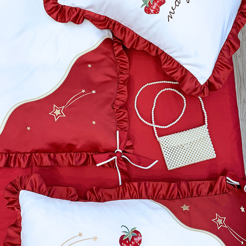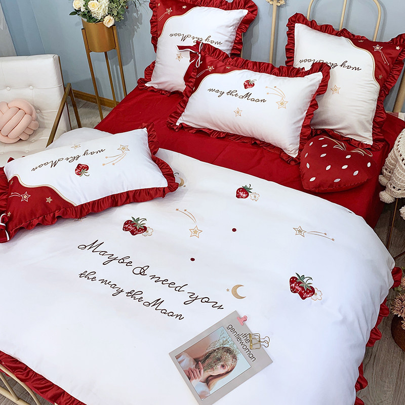 Douyin the same quilt cover strawberry cotton four-piece princess quilt girl heart ice silk embroidery double