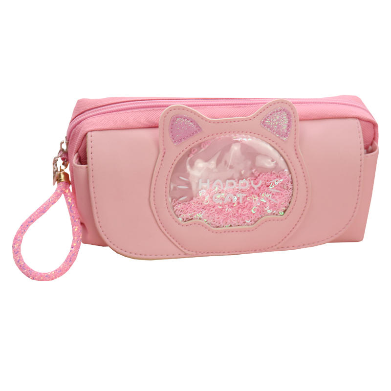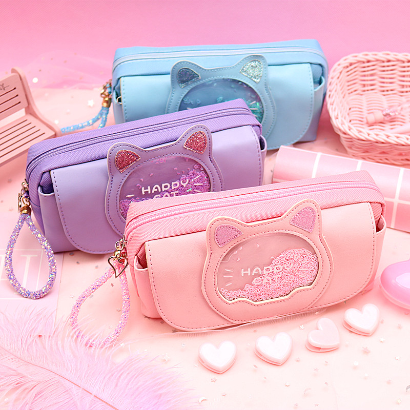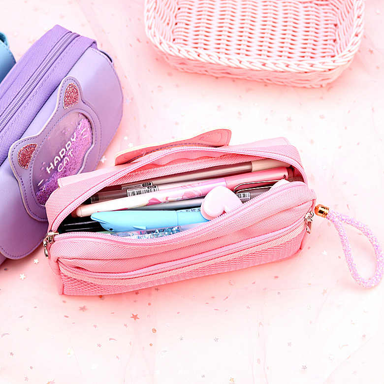 Net red quicksand pencil case female primary school cat pencil case stationery bag cute simple three-layer large-capacity girl heart
