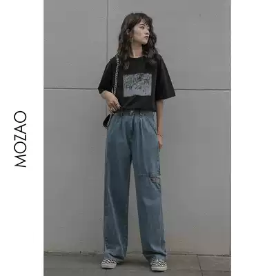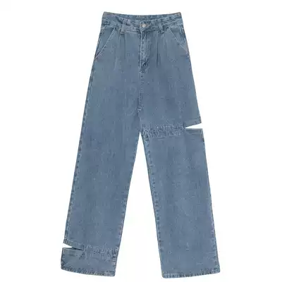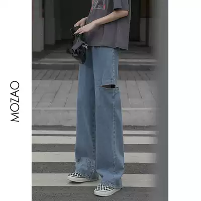 Hole mop jeans women 2021 autumn and winter New loose high waist straight draped wide leg Hyuna thin pants