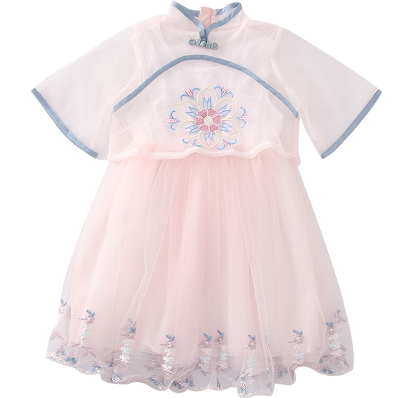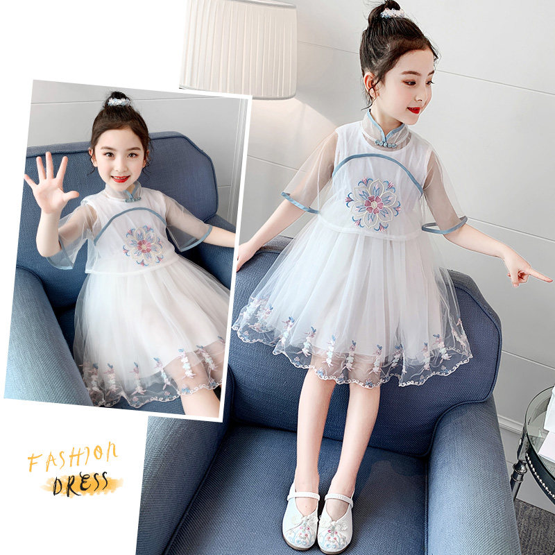 Girls Hanfu Dress Summer Dress 2020 New Children's Retro Embroidered Skirt Short Sleeve Girls Princess Mesh Skirt