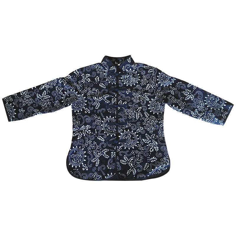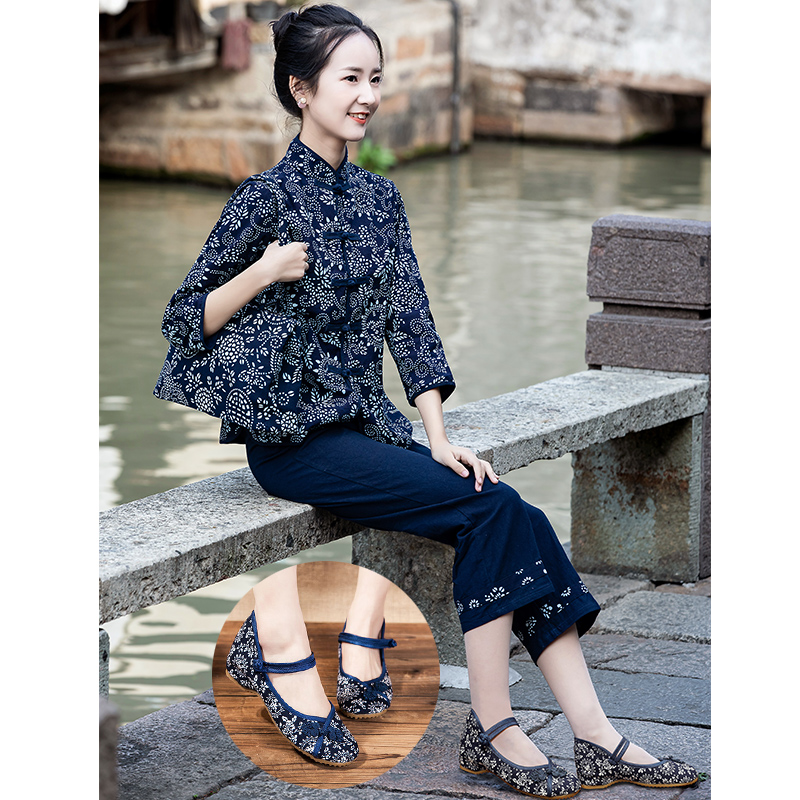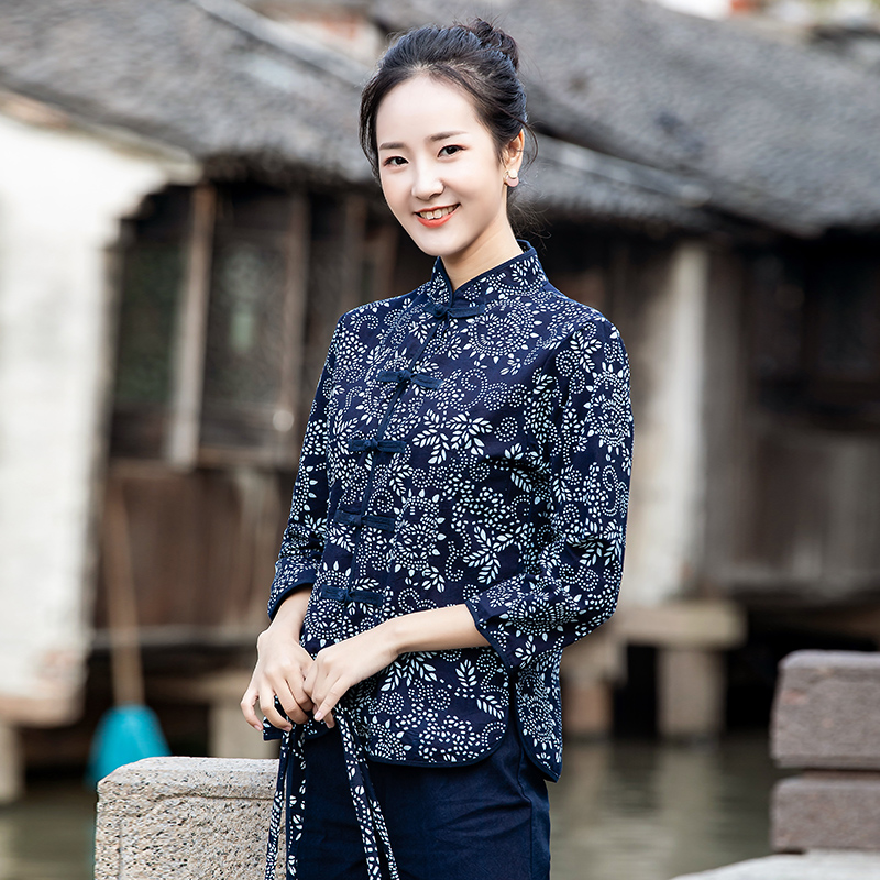 Uzhen Blue Printed Cloth Handmade Pan Button to flap Long sleeve blouse Ladies shirt Leisure farm Hotel Worksuit Suit