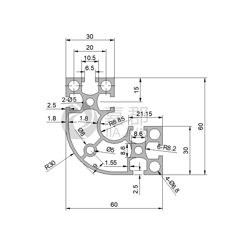 Industrial aluminium extrusion material national standard 6630R arched aluminium alloy profile 6060 30 semicircular corner electrophoretic aluminium