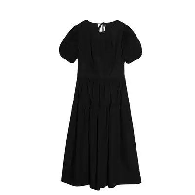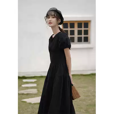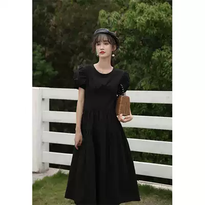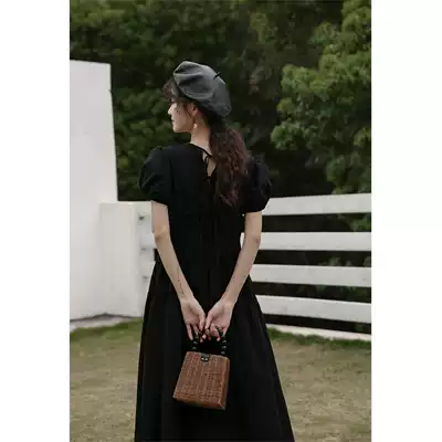 Deer head black bubble sleeve dress female 2021 new slim slim long skirt female summer back lace-up skirt