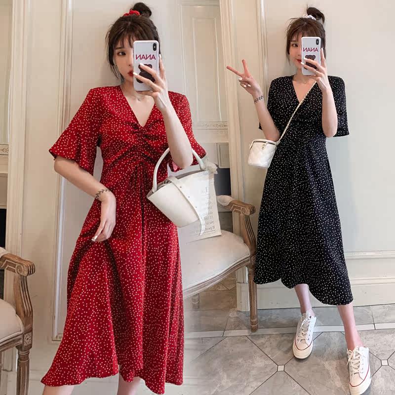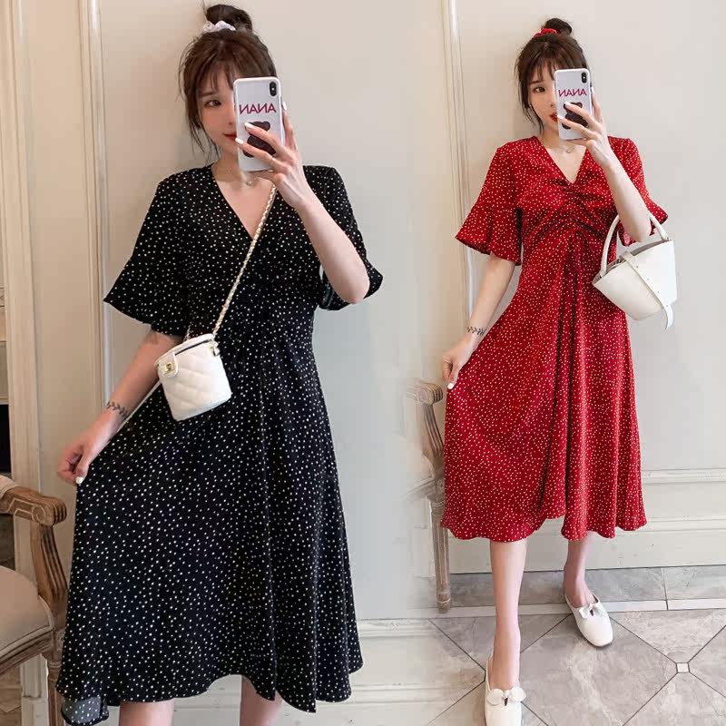 Pregnant Woman Skirt Summer Boomer Pregnancy Woman Dress Summer Skirt Large Size Snowspun Short Sleeve Blouse Summer V Collar Polo Dot Ocean Dress