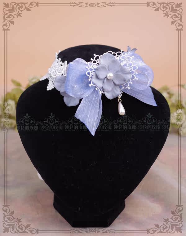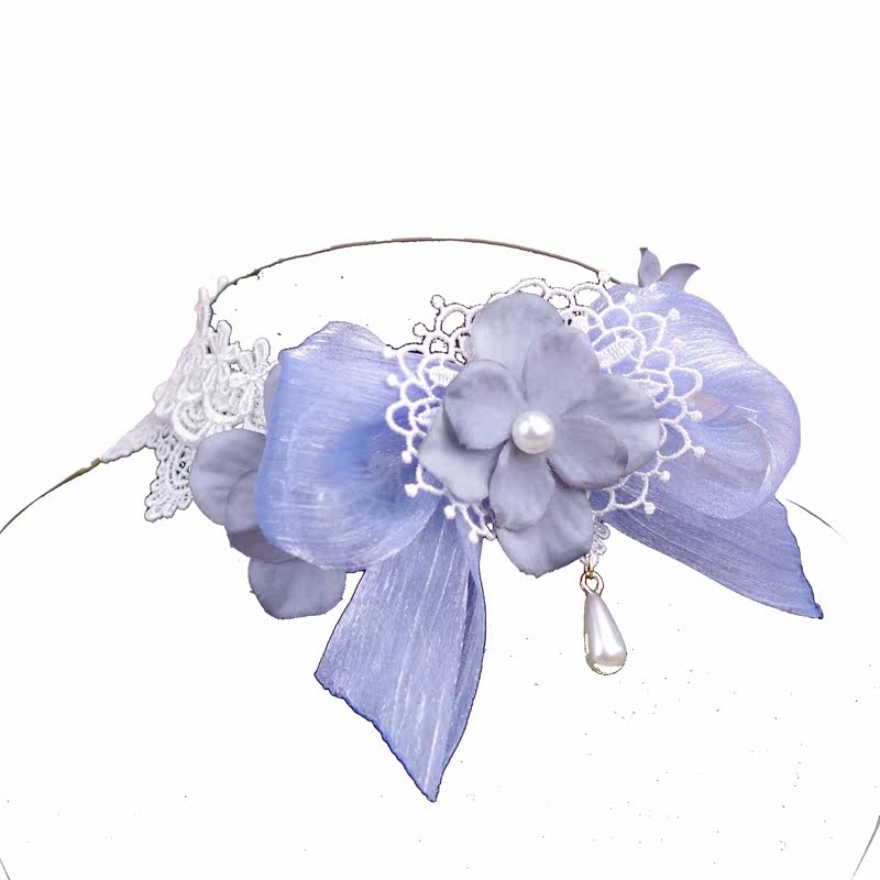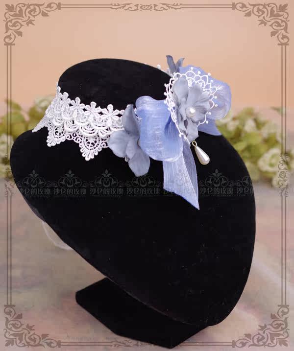 Original *Condensed Heart Flower Dream* (blue gray) hydrangea Lolita lace necklace bow choker