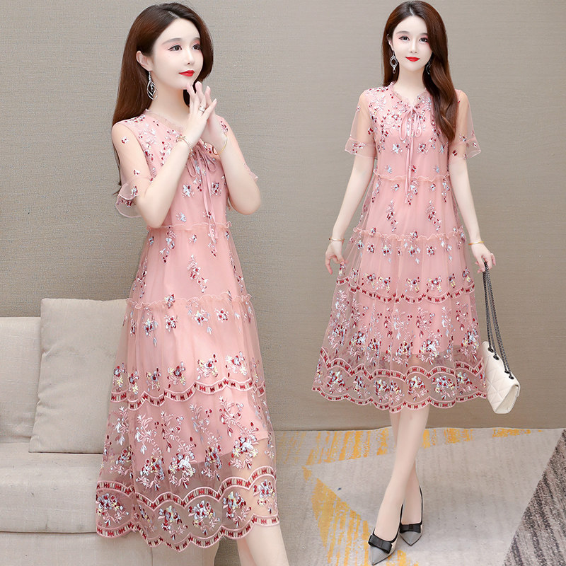 Embroidered Ocean Dress Women 2022 New Foreign Pie Minus age loose Belly High-end Pink Overknee Mesh Yarn A dresses Summer