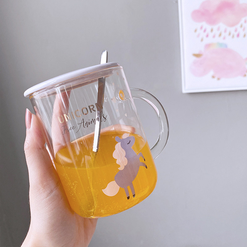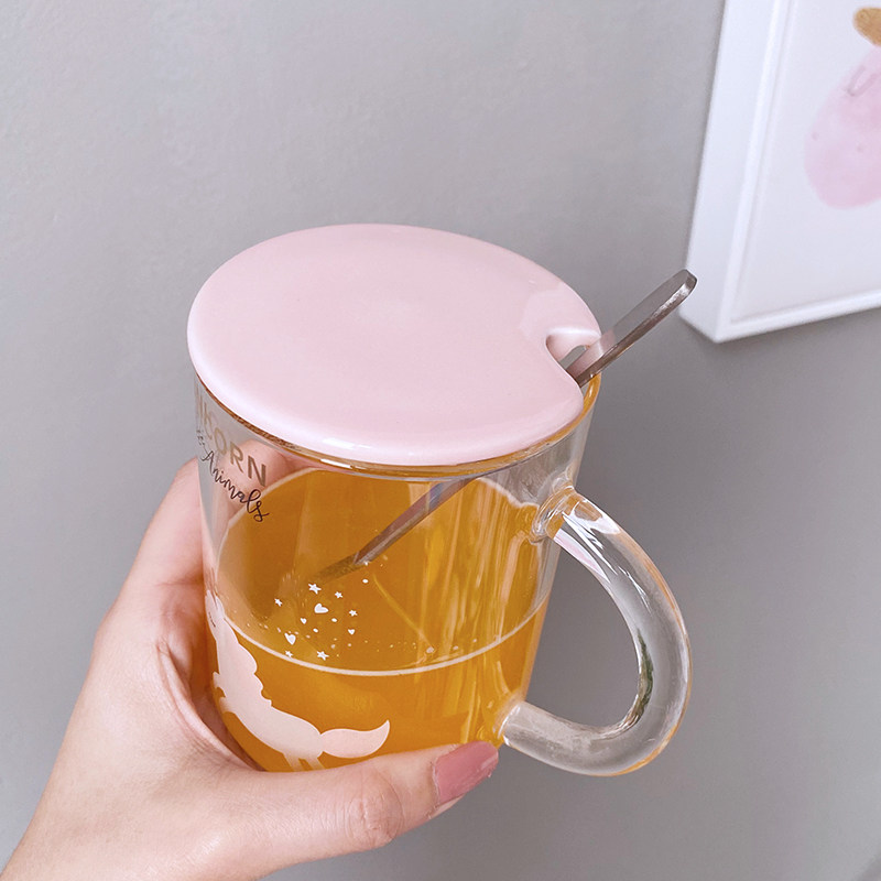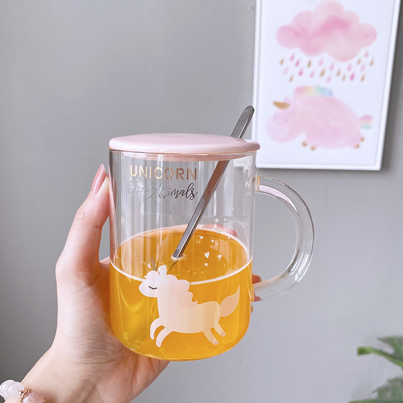 ins Girls' Heart Net Red Unicorn Glass Cup with Lid Spoon Mug Creative Cute Breakfast Cereal Cup Home