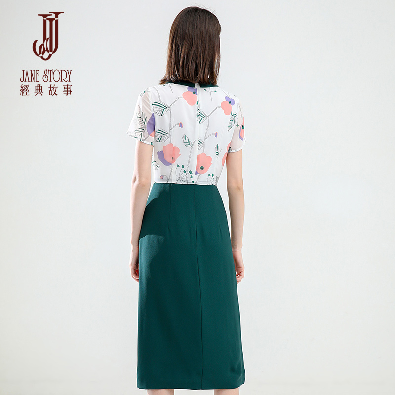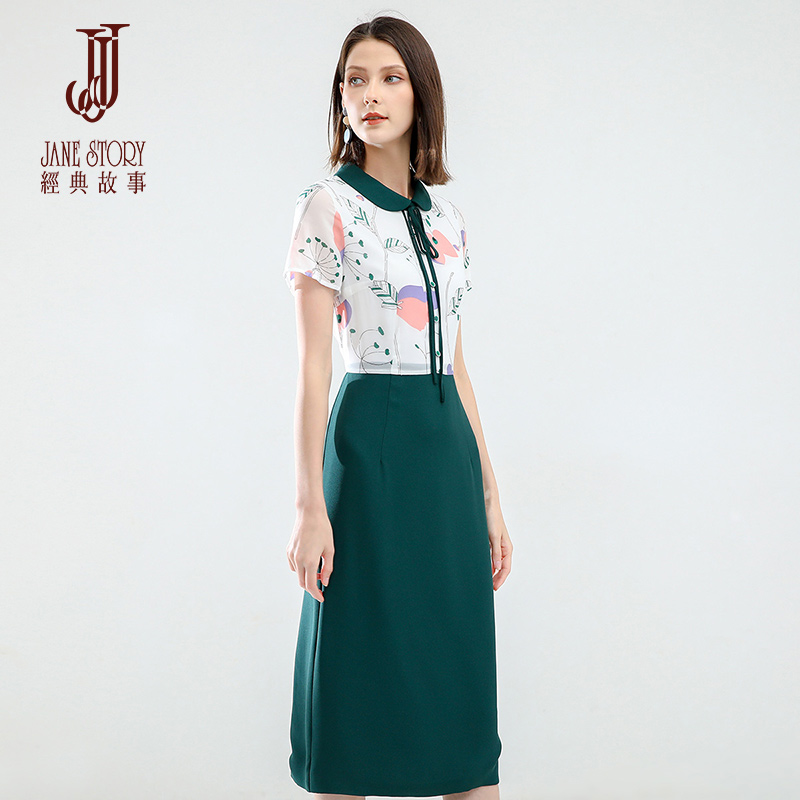 2022 Summer new dolls collar splicing display slim A-style slim fit mid-skirt short sleeve printed foreign dress