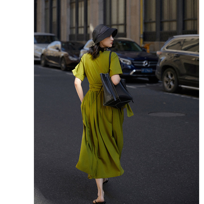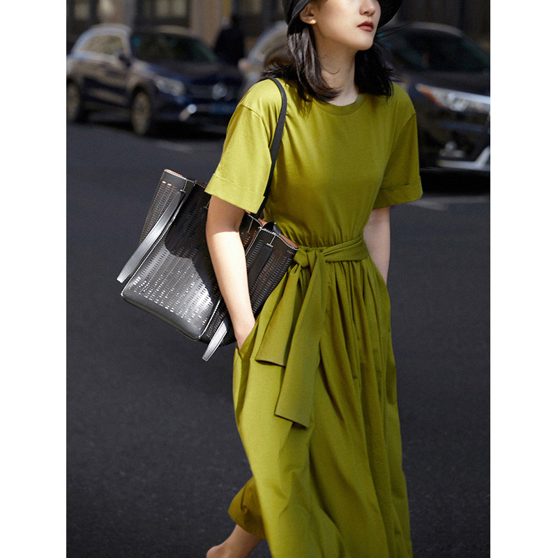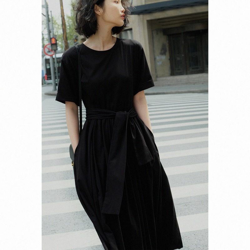 Time of Remain CHAO Large pendulum Summer pure cotton comfort strap to collect waist short sleeves T-shirt for women's length E L