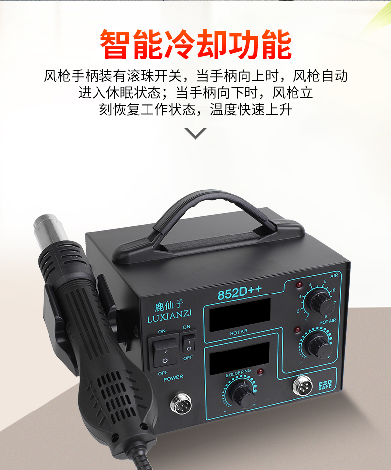 Deer Fairy 858 Single Wind Gun (without digital display) (Upgraded version) Deer Fairy 858D + Single Wind Gun (Upgraded Version) Digital Display 858D + Deer Fairy (Double Digital Display) 852D++ Deer Fairy 852D++ Double Digital Display (with Bracket) 852D++ Dual Digital Display 2 in 1+22 Pieces 852D++ Dual Digital Display (Bracket Model) +22 Pieces 852D++ Dual Digital Display 2 in 1+25 Pieces 852D++ Dual Digital Display (Bracket Model) + 25 Pieces Syke 852D Dual Digital Display 2 in 1+ (24 Pieces) Syke 852D++ (Double Digital Display +Bracket) 24pcs Syke (Double Digital Display 2-in-1) 852D++ Secco (Double Digital Display 2-in-1) 852D++ with Bracket 852D+ (Double Digital Display 2-in-1) Air Gun Welding Station 852D+ (Double Digital Display 2-in-1) Soldering Station +852D+ (Double Digital Display 2-in-1) Soldering Station Deer Fairy 852D++ (Soldering Iron + Air Gun Handle)