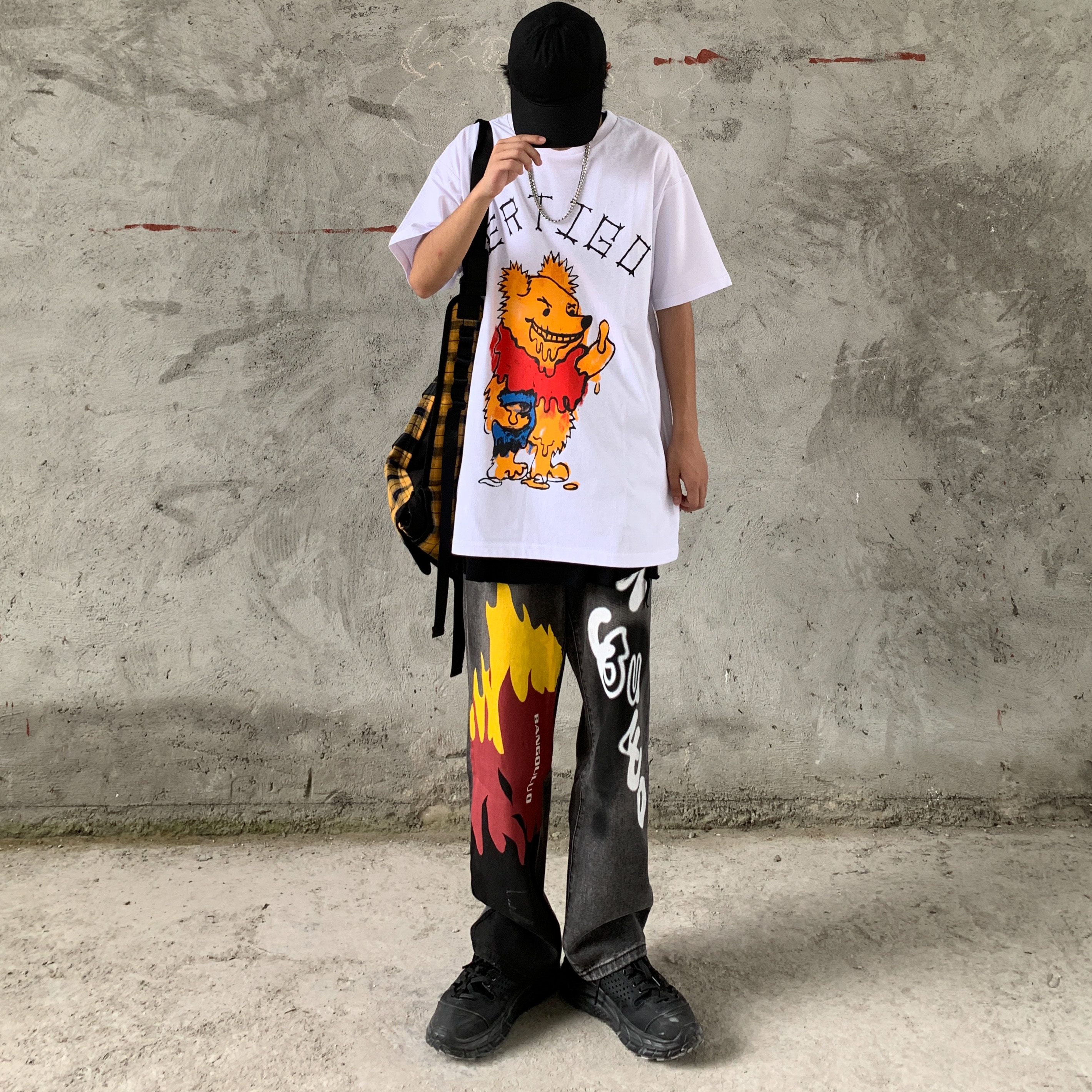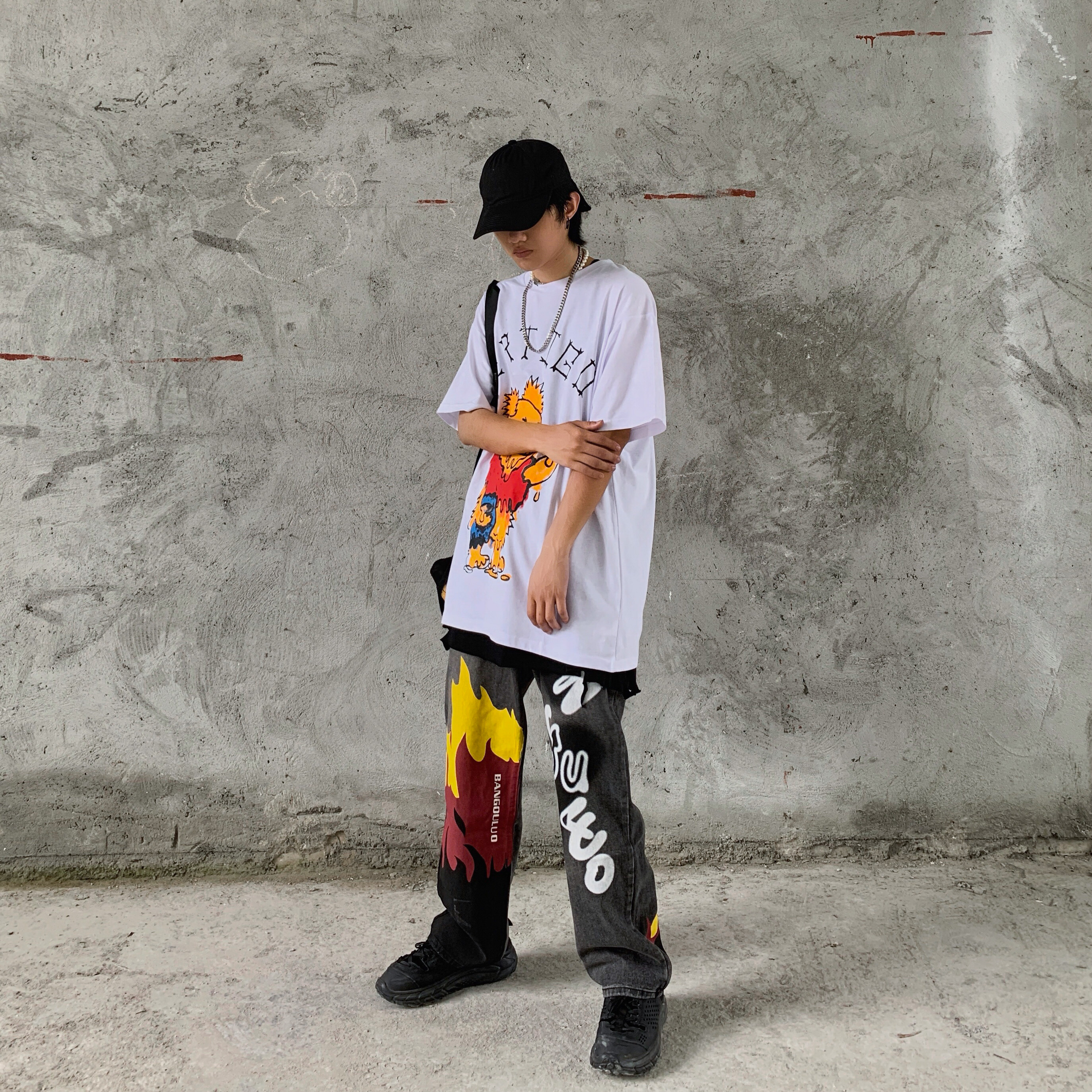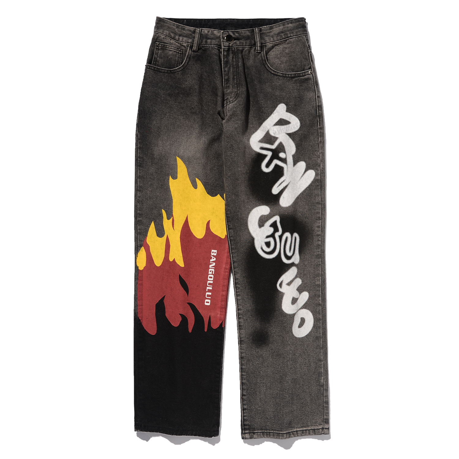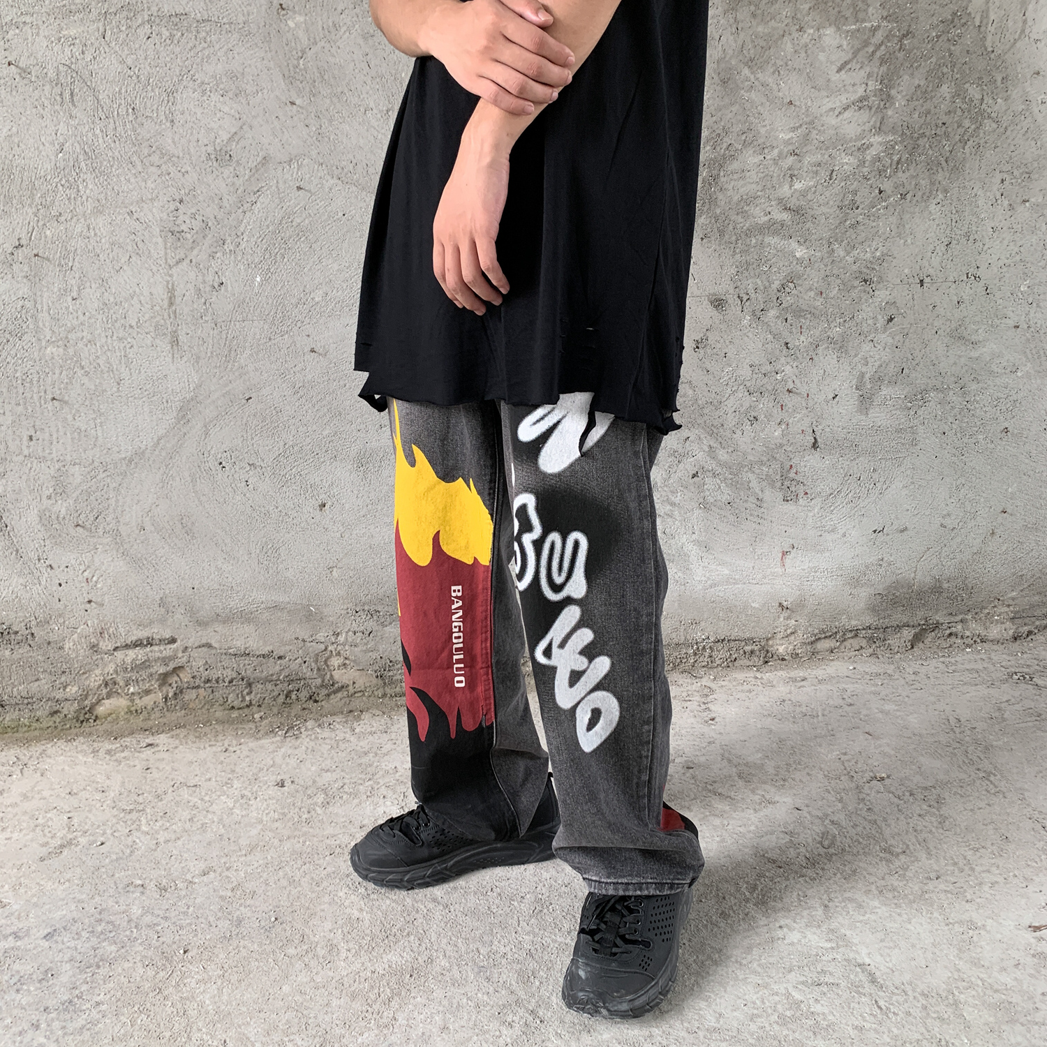 Smoke gray retro washed flame graffiti print straight tube loose mopping drop feeling tide brand Dad jeans men