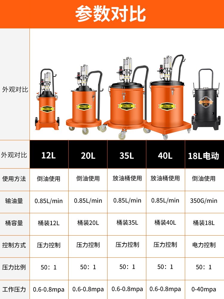 12 liter butter bare machine 12 liter (standard) regulator valve + 4 m high pressure tubing + cardan gun + 6 m quick connecting gas pipe 12 liter (high) oil and water separator + 4 m high pressure tubing + universal oil gun + 6 m quick connecting gas pipe 20 liters (standard) regulator valve + 4 m high pressure tubing + universal oil gun + 6 m quick connecting gas pipe 20 liters (high distribution) oil water separator + 4 m high pressure tubing + universal oil gun + 6 m quick connecting gas pipe 35 liters remixable barrel (standard) regulator valve + 4 m high pressure tub + universal oil gun + 6 m quick connecting pipe 35 liters of receptive barrel (high-end) oil-water separator + 4 m high-pressure tubing + universal oil gun + 6 m gas pipe 40 liters of receptive barrel (standard) regulator valve + 4 m high pressure tubing + universal oil gun + 6 m quick connecting gas pipe 40 liters can be put into the barrel (high) oil-water separator + 4 m high pressure tubing + cardan gun + 6 m gas pipe 18L electric butter machine (24V) 18L electric butter machine (220V)