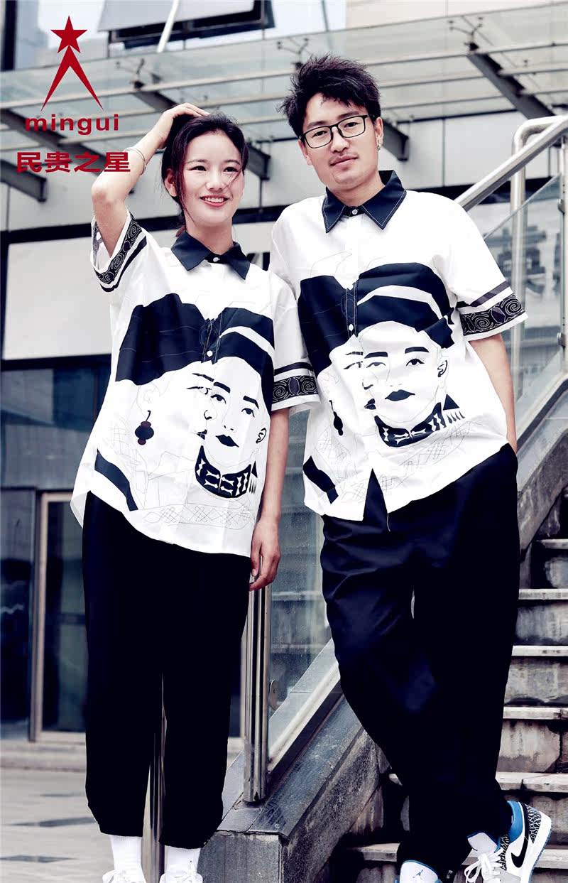 The Minexpensive Star 2022 New Men and Women Couple Suite Liangshan Yi Printed Black White Shirt National Wind