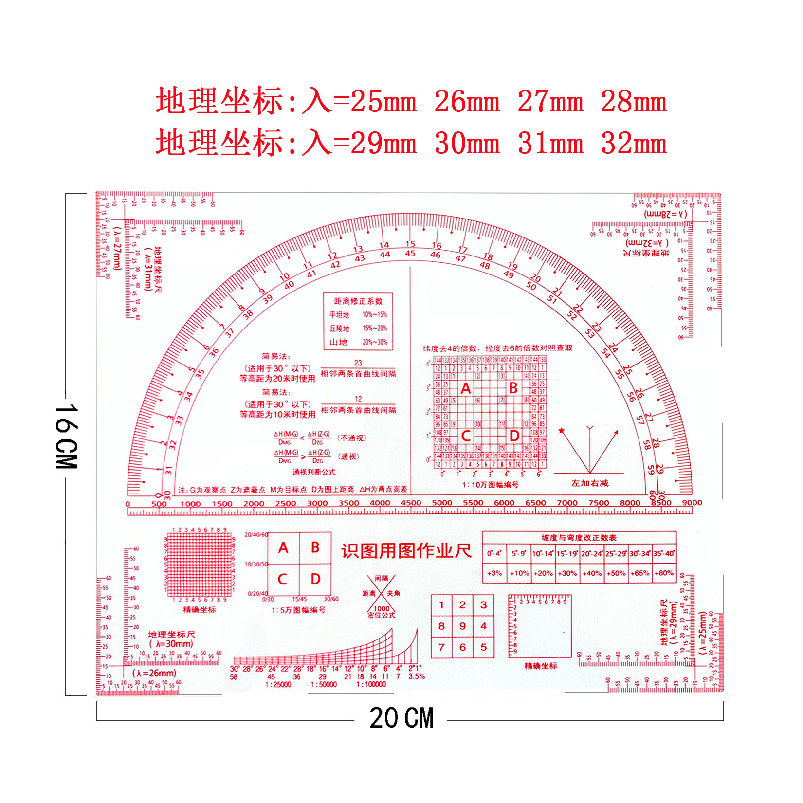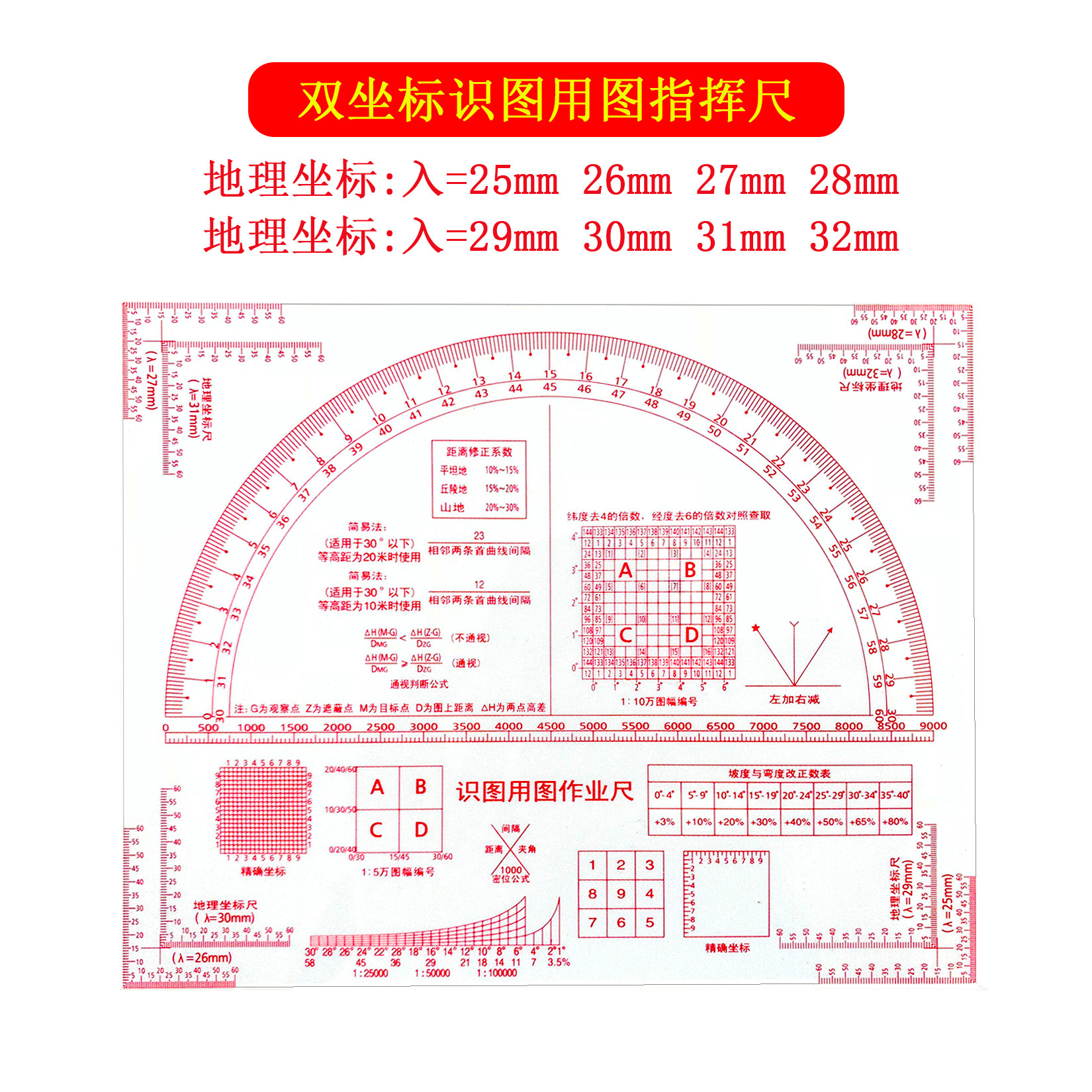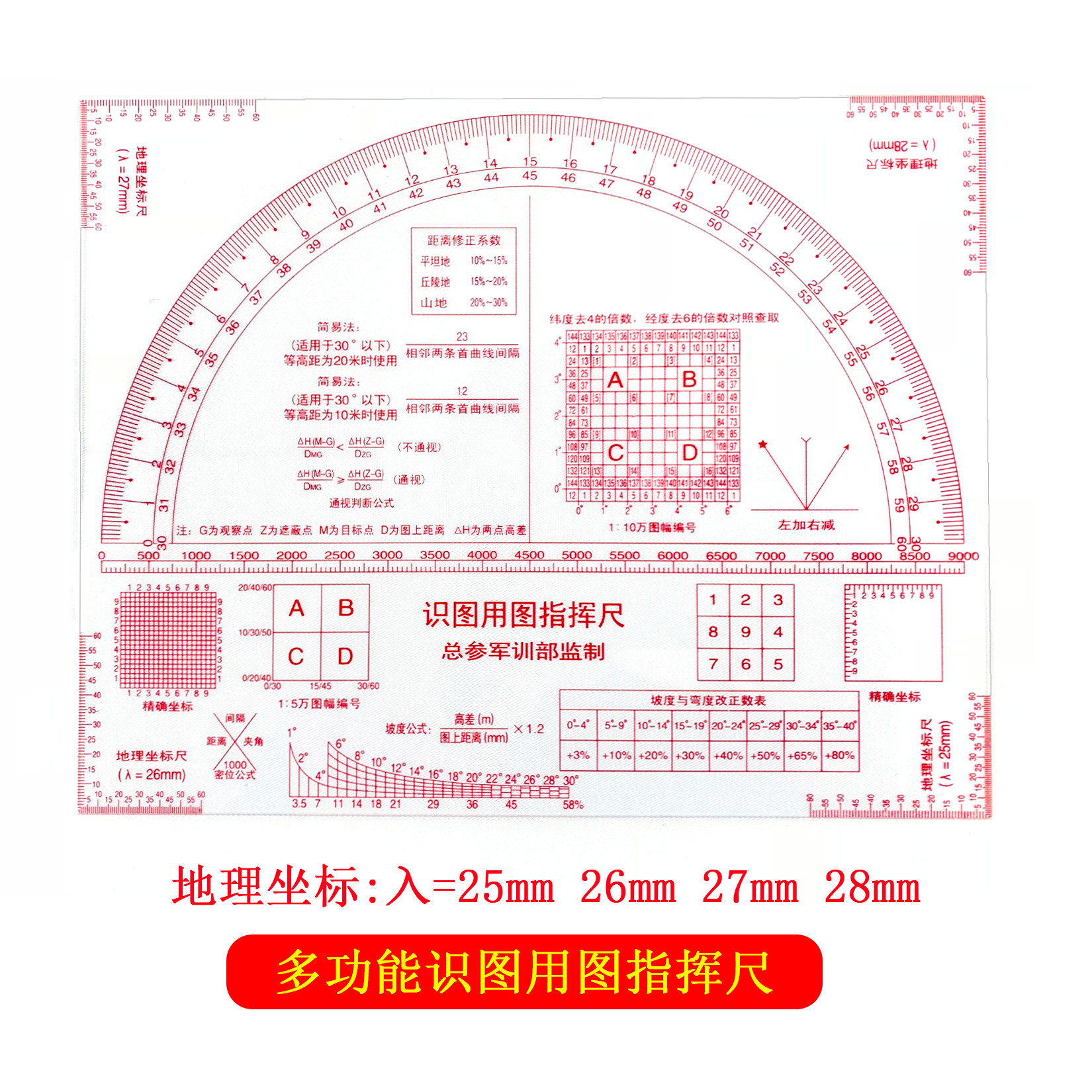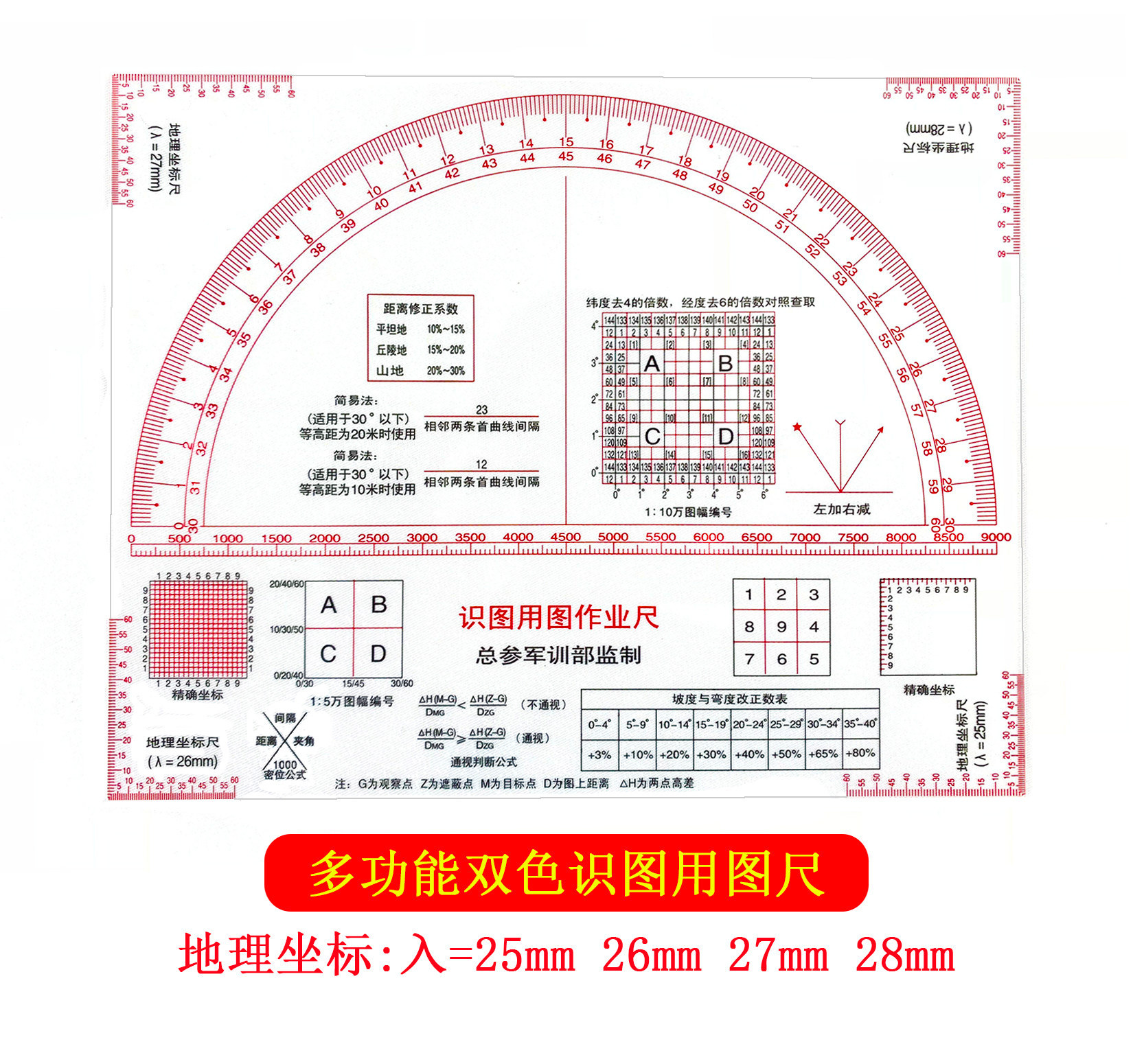New two-coordinate identification map ruler 1:50,000 geographic coordinate ruler Military terrain command ruler Slope identification ruler
