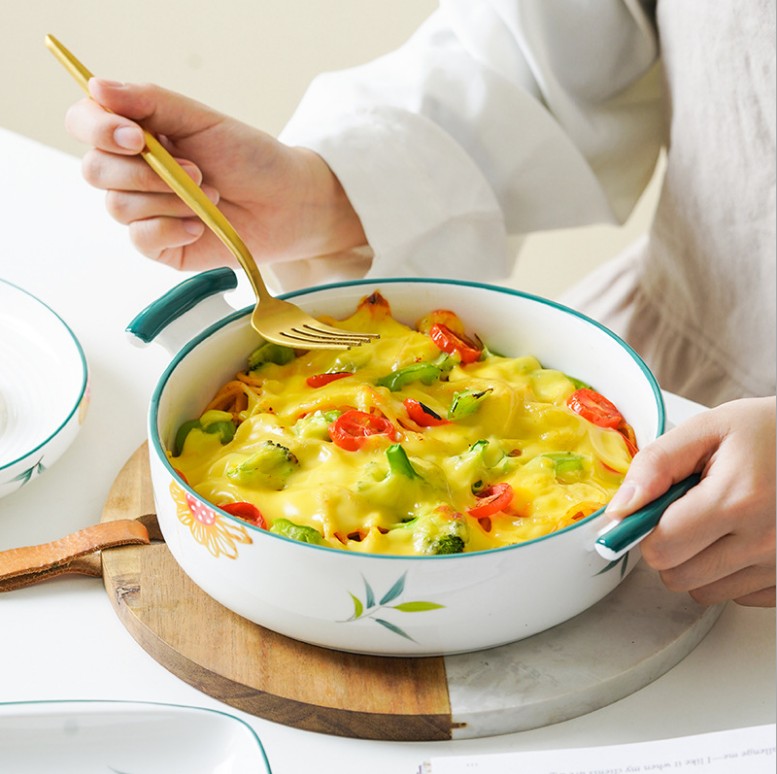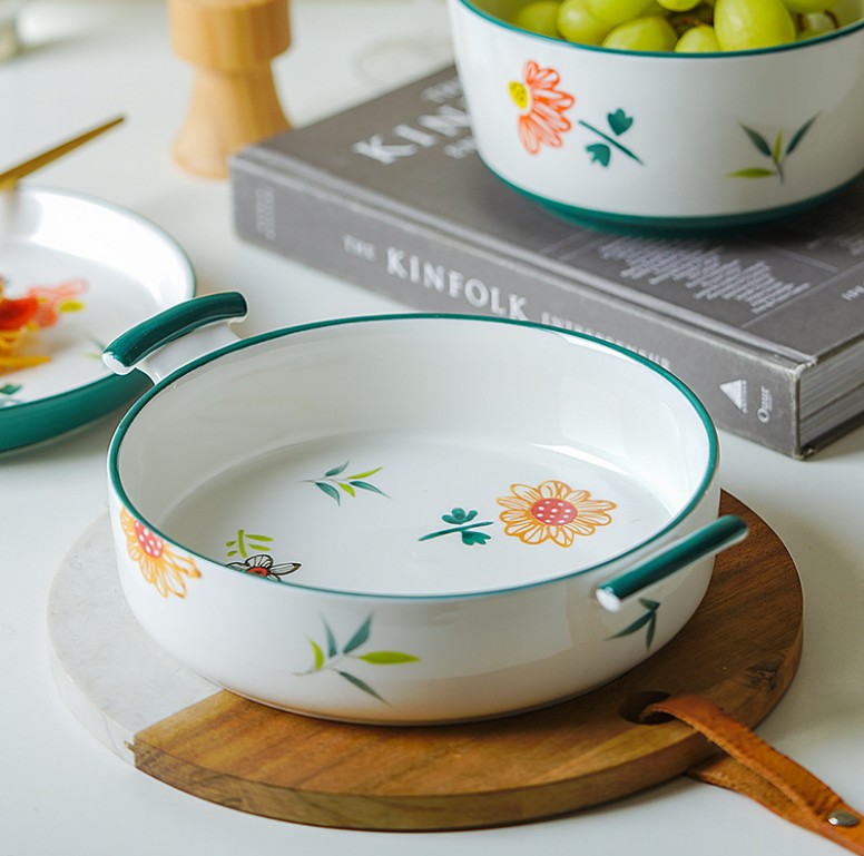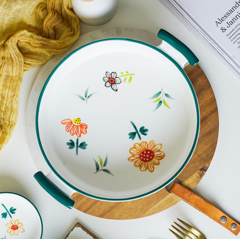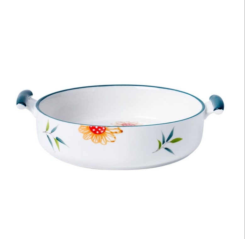 Twin ear grilled ceramic dish baking rice dish baking microwave oven Western food plate oven dedicated creative plate household