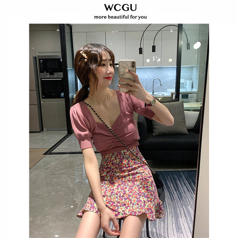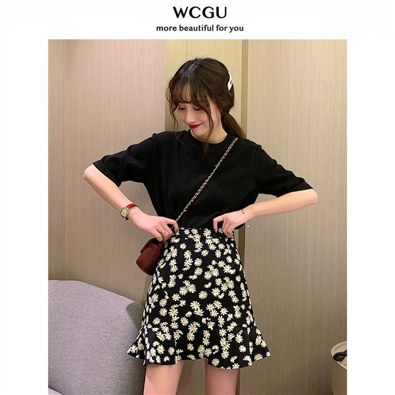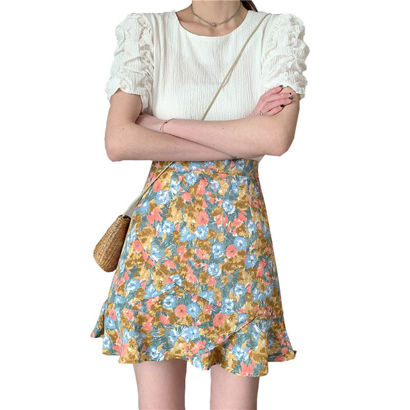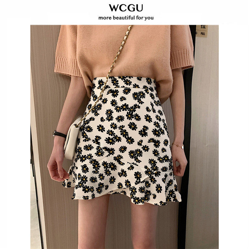Oil painting short fish tail skirt high waist hip skirt women's 2021 summer new little daisy flower a short skirt
